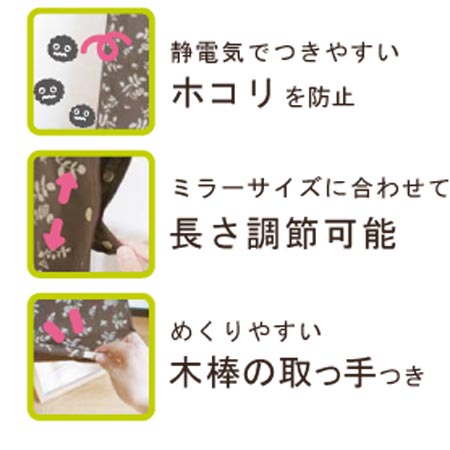 ![]() 静電気でつきやすいホコリを防止 スタンド式ミラーの気になるホコリをおしゃれに防いでくれる優れもの♪ | ![]() ミラーの長さに調節可能 ワンタッチでとめられるボタンが3箇所についているのでミラーに合わせてちょうど良いサイズに調節できます。 | |
