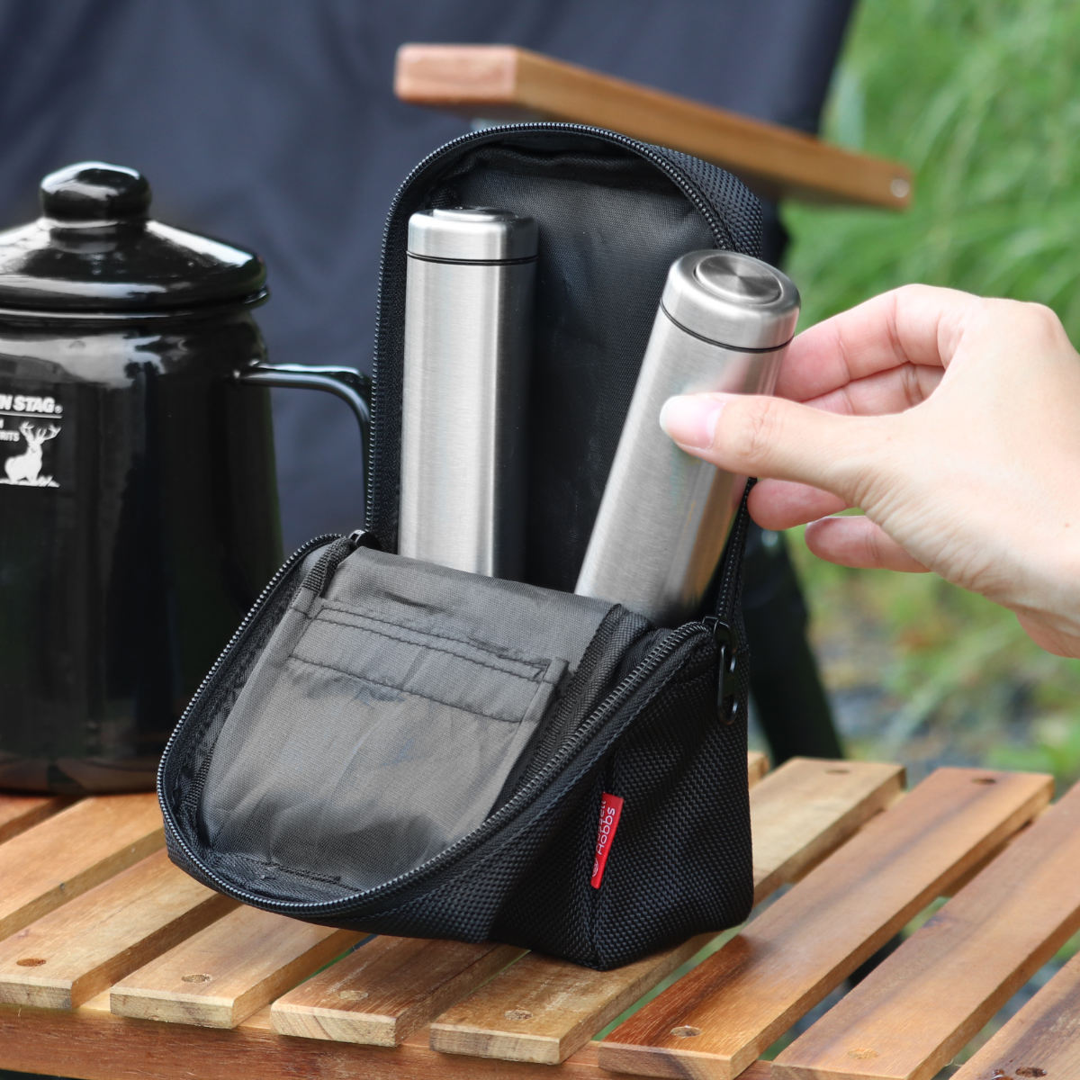 前面がガバッと開くので、ミルをスムーズに取り出すことができます。ジッパーを開けてポーチの上半分を両側とも折りたためば、ポーチに入れたままの状態で立ててご使用いただけます。ポーチのままお使いいただけば、木製スタンドが汚れる心配もありません。