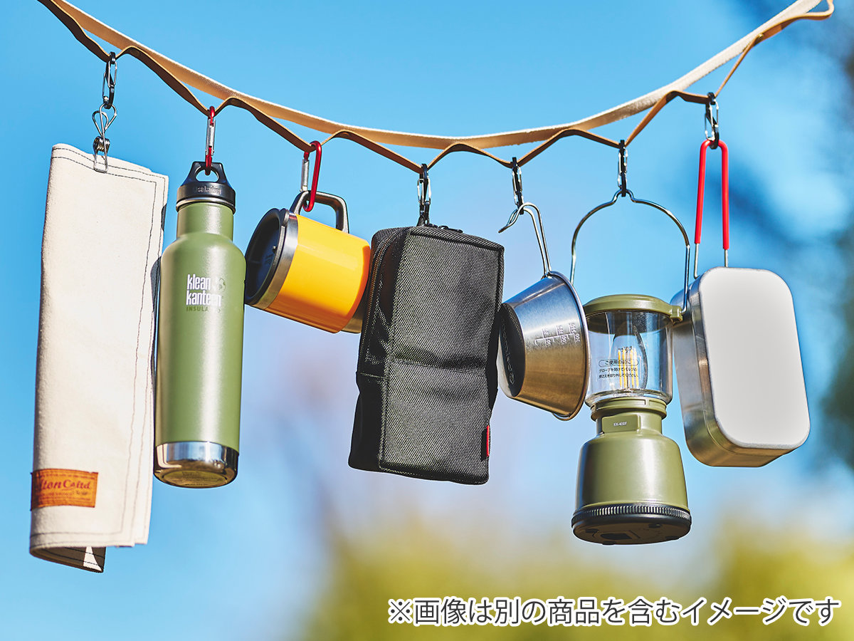 ポーチの背面にはフックなどに引っ掛けて使えるループが付いています。屋外で置き場所に困るときでも、ロープやハンギングチェーンなどにフックで吊るしておけます。