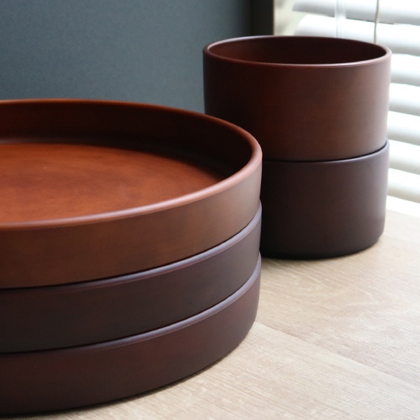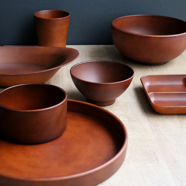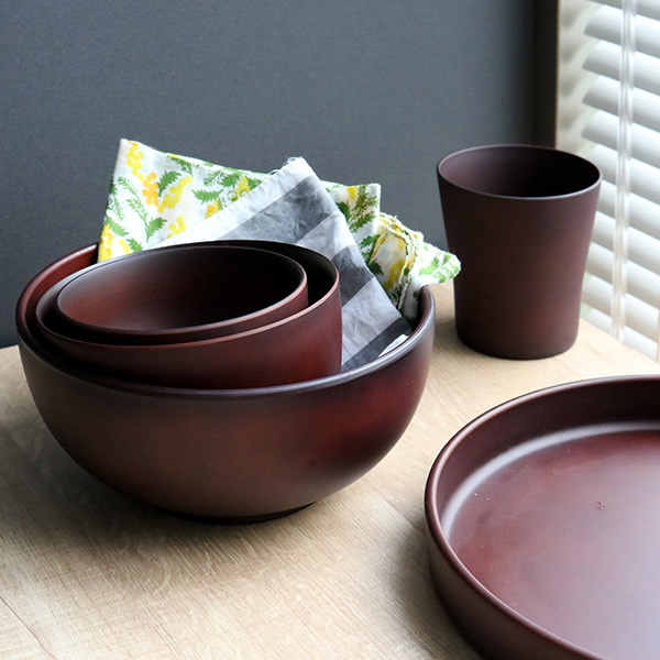 見た目は木製に見えるこちらの食器は、樹脂でできているので木製に比べて乾きが早くお手入れも簡単です。また、電子レンジ・食洗機どちらにも対応しています。