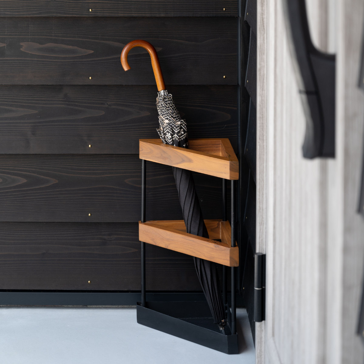 温かみのあるチーク材とスタイリッシュなアイアンを組み合わせたアンブレラスタンドです。インテリアとしても映えるデザインに、場所を取らずにしっかり収納できるカタチがポイントです。