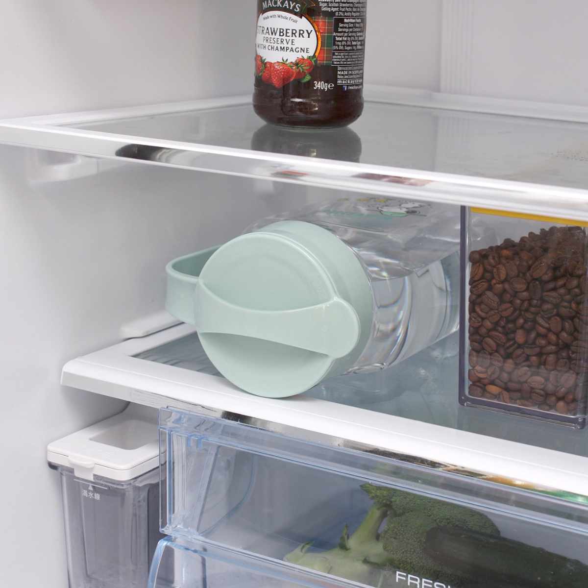 水漏れを防ぐパッキン付きで、しっかり密封してくれるので、横向きに置けて冷蔵庫の棚置きも可能です。冷蔵庫の空いたスペースを有効利用できます。