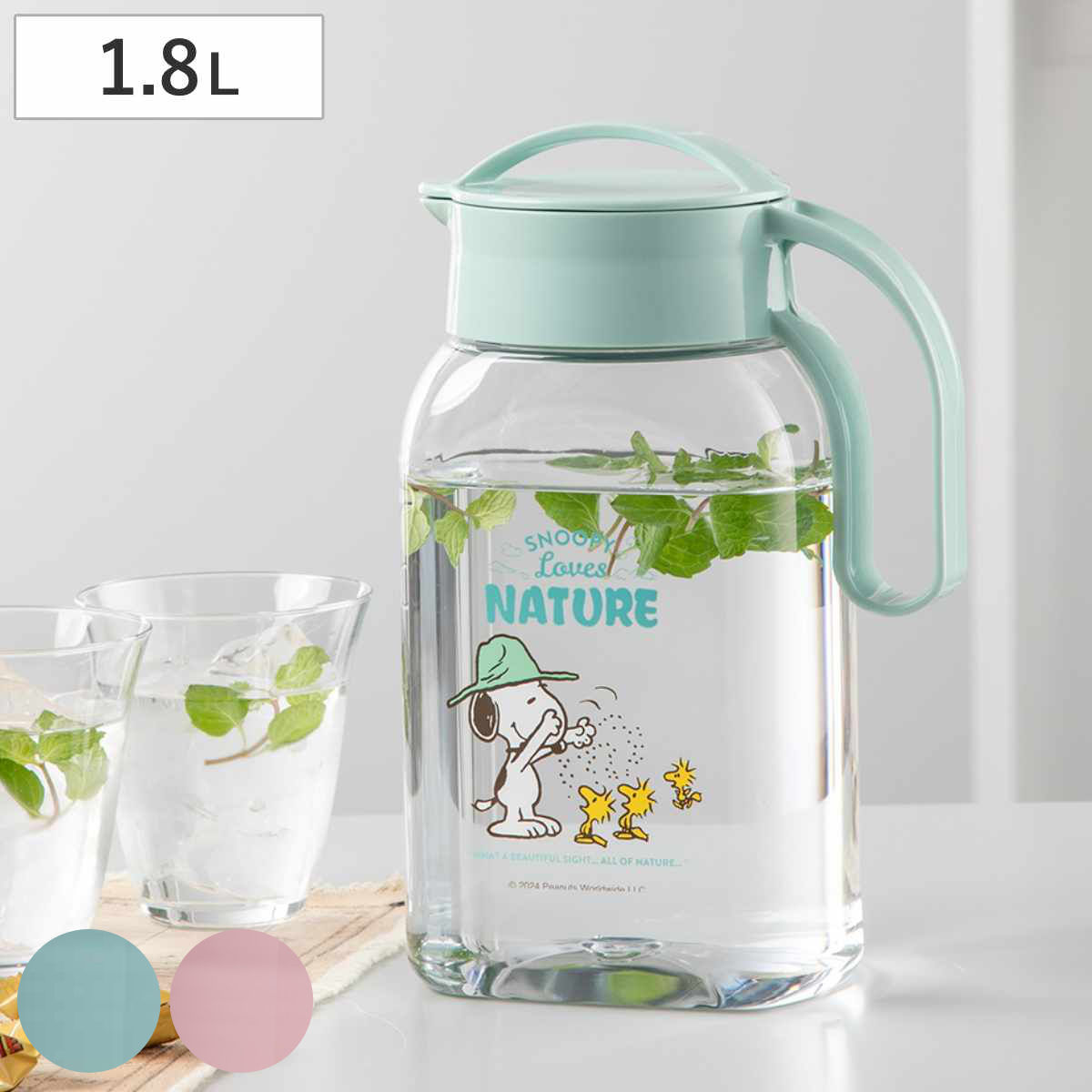 スヌーピーがデザインされた冷水筒です。1.8Lと大容量なので、たっぷり飲めて作り置きにも便利なサイズです。また、ハンドル付きで握りやすく、安定して注ぐことができます。