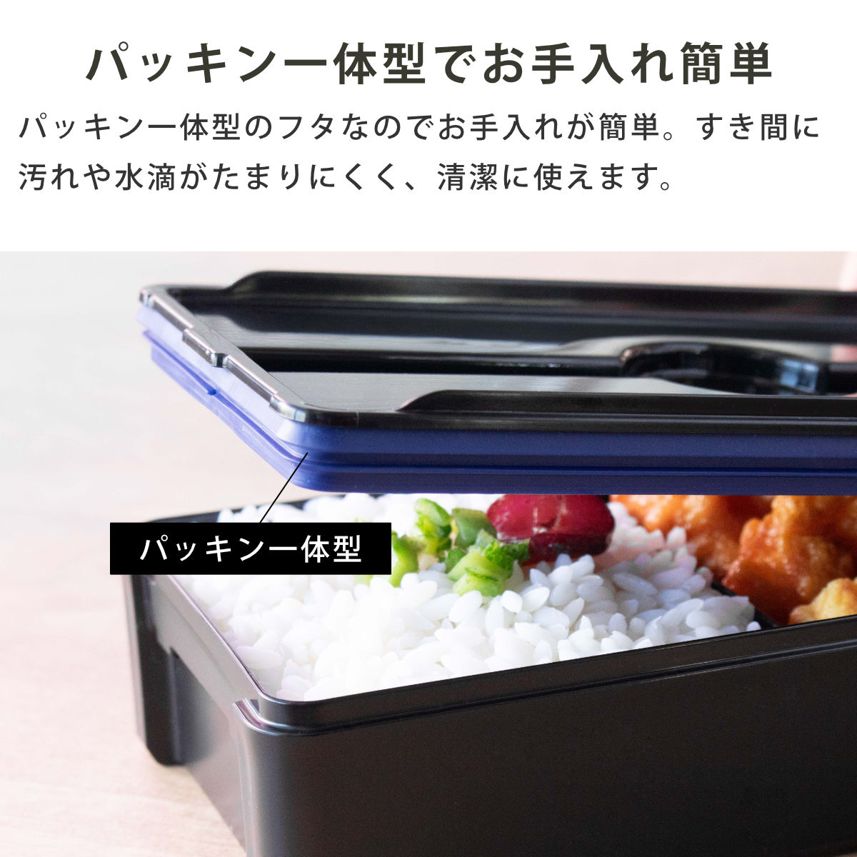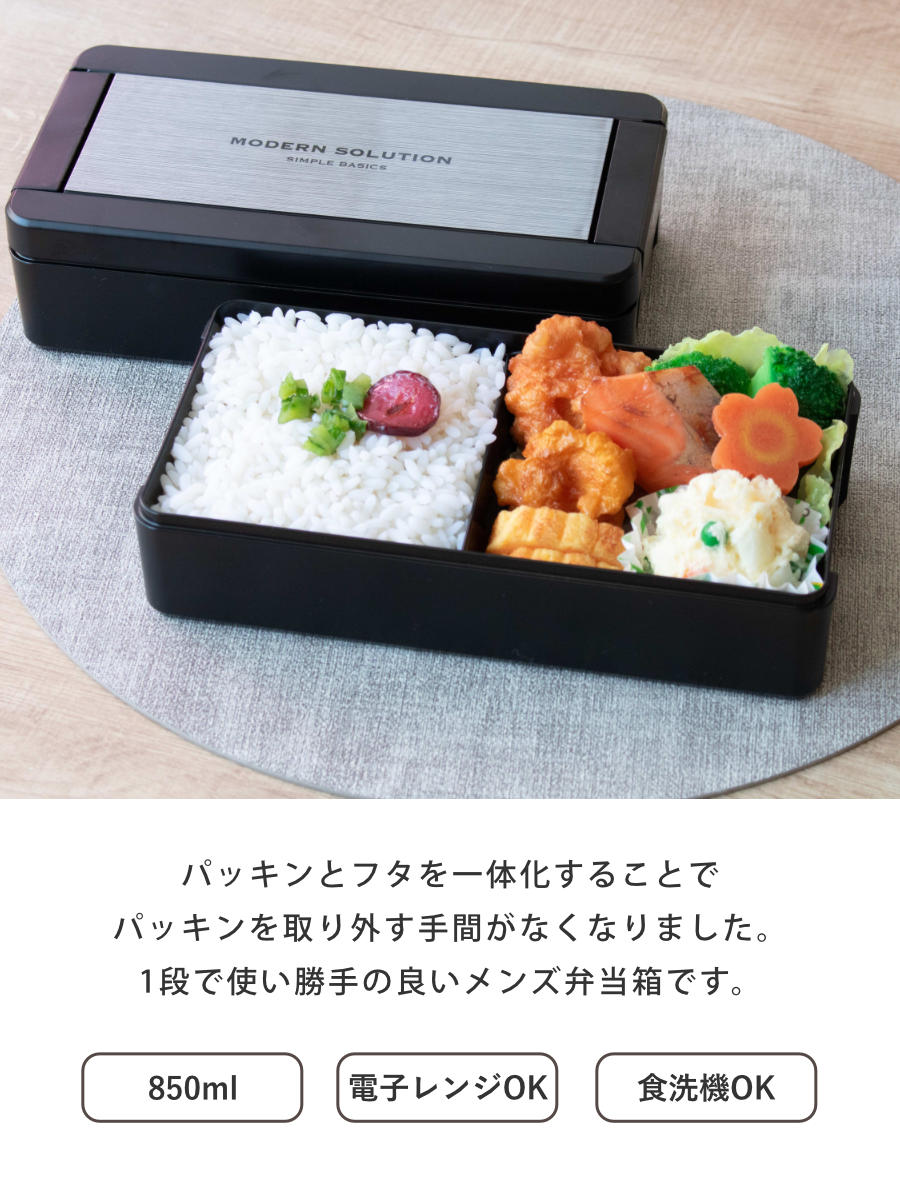 弁当箱 1段 850ml イージーケアランチボックス ( お弁当箱 ランチボックス レンジ対応 食洗機対応 一段 大容量 男子 レンジOK 食洗機OK お弁当 弁当 仕切り付き 箸付き パッキン一体式 男性 ) 【ブラック】