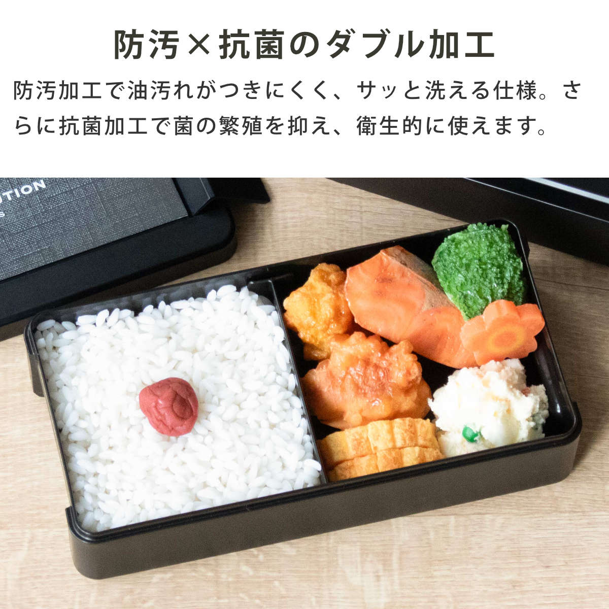 | 材質 | 本体・中皿・中仕切り:ポリプロピレン 箸:AS樹脂 蓋・留め具:ABS樹脂 パッキン:熱可塑性エラストマー |