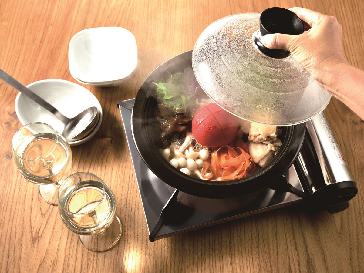 鍋身は、耐熱性に優れたMADE IN JAPANの萬古焼です。直火だけでなく、電子レンジ、オーブン調理も可能です。