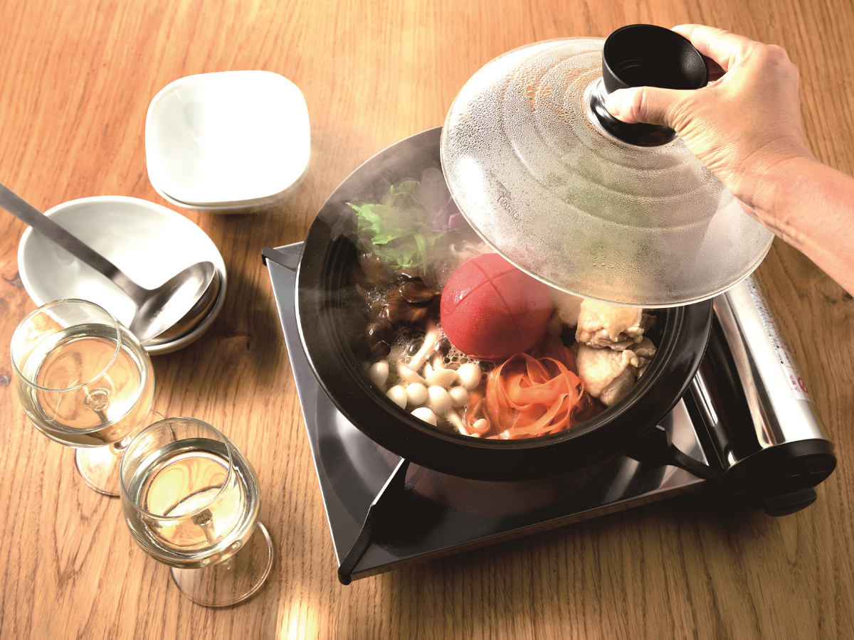 鍋身は、耐熱性に優れたMADE IN JAPANの萬古焼です。直火だけでなく、電子レンジ、オーブン調理も可能です。