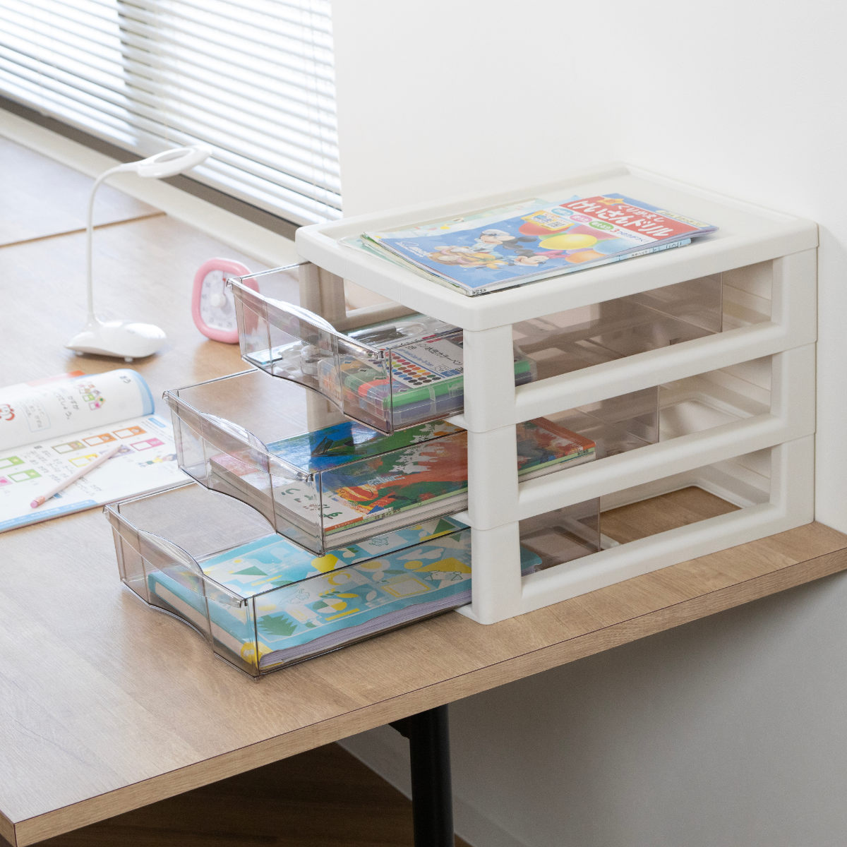 デスクの卓上収納としてだけでなく、棚上収納としても便利にお使いいただけます。本棚の一部に取り入れたり、ラックに並べて分別収納に使えば、棚上収納を充実させられます。