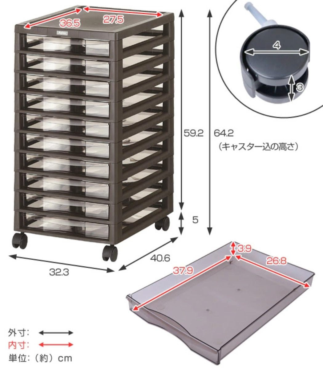 | 材質 | 本体:ポリプロピレン 引出し:ポリスチレン |