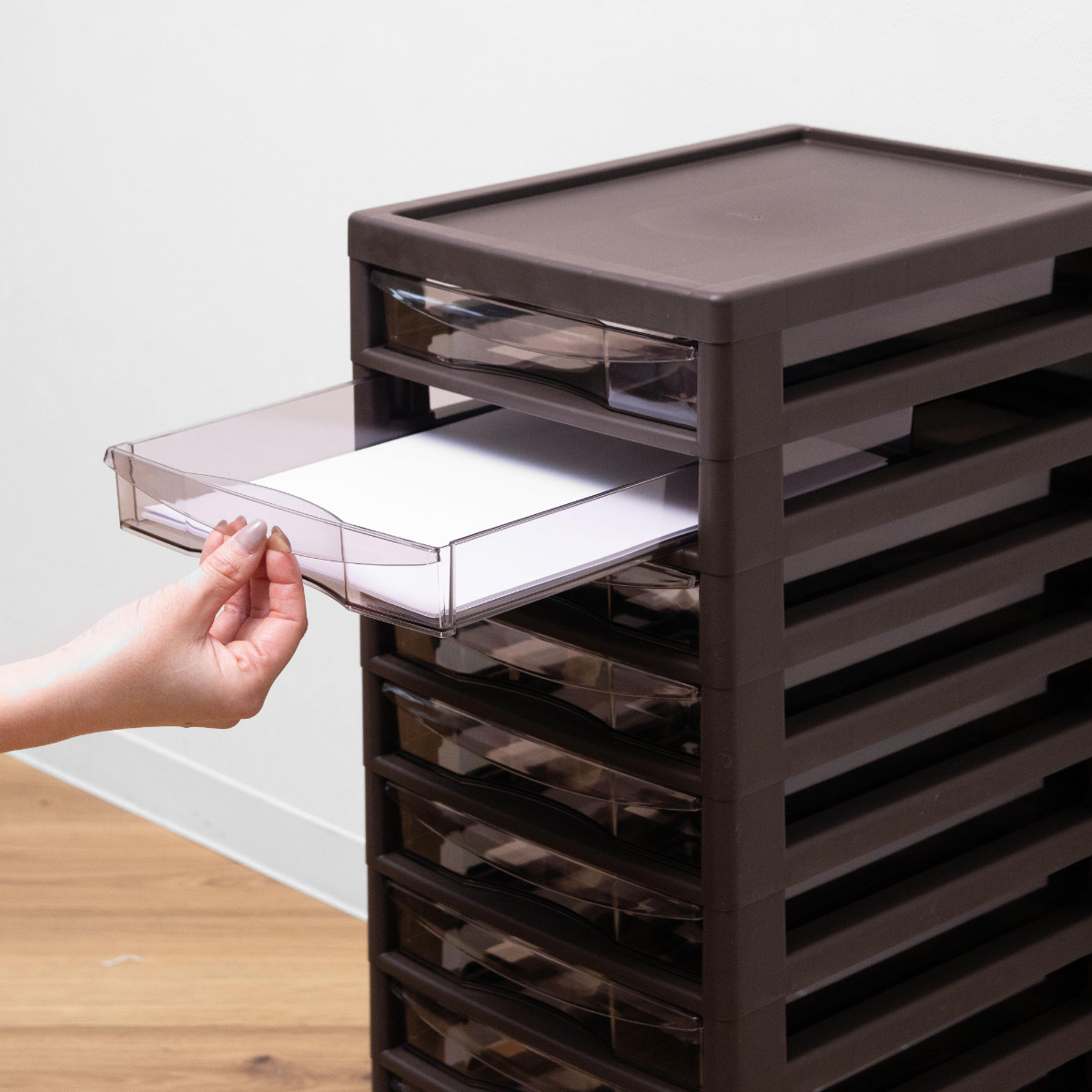 引き出しはB4サイズの浅型で、書類やファイルの収納に便利なサイズです。引き出しやすい取っ手付きで開けやすく、ストッパーが付いているので、引き出し過ぎて抜けてしまう心配がありません。外したい時は、強く引くか、引き出しの側面を少し内側にたまわせることで簡単に外すことができます。クリアブラウンカラーで透けて見えるので、引出しを開けなくても中身が確認しやすくなっています。