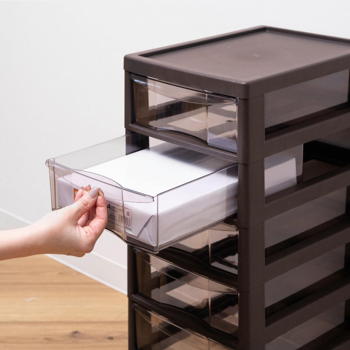 引き出しはB4サイズの深型で、書類やファイルの収納に便利なサイズです。引き出しやすい取っ手付きで開けやすく、ストッパーが付いているので、引き出し過ぎて抜けてしまう心配がありません。外したい時は、強く引くか、引き出しの側面を少し内側にたまわせることで簡単に外すことができます。クリアブラウンカラーで透けて見えるので、引出しを開けなくても中身が確認しやすくなっています。