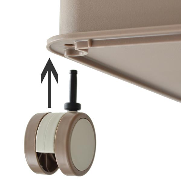 対応する収納ケースの底面にあるキャスター差し込み用の穴に、キャスターをカチンと音がするまで差し込むだけで、簡単に取り付けができます。キャスターを取り付けると、収納ケースがの高さが約5.5cm高くなります。