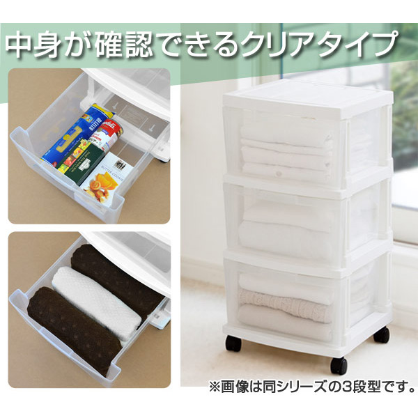クリアタイプの引き出し収納ですので、衣類はもちろん、タオルやおもちゃ、食品など、どこにしまったか一目瞭然です。