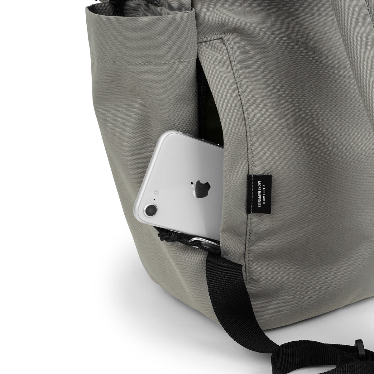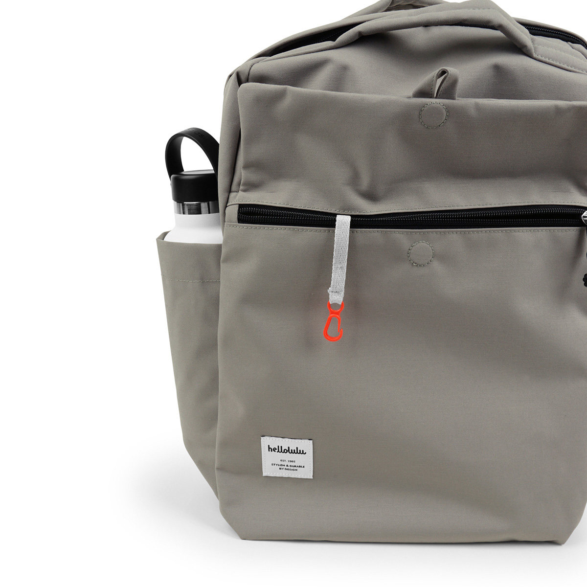 両サイドにはペットボトルやタンブラーが収納できるポケットが付いています。フロントポケットにはキークリップが付いており、鍵の迷子防止にもなります。