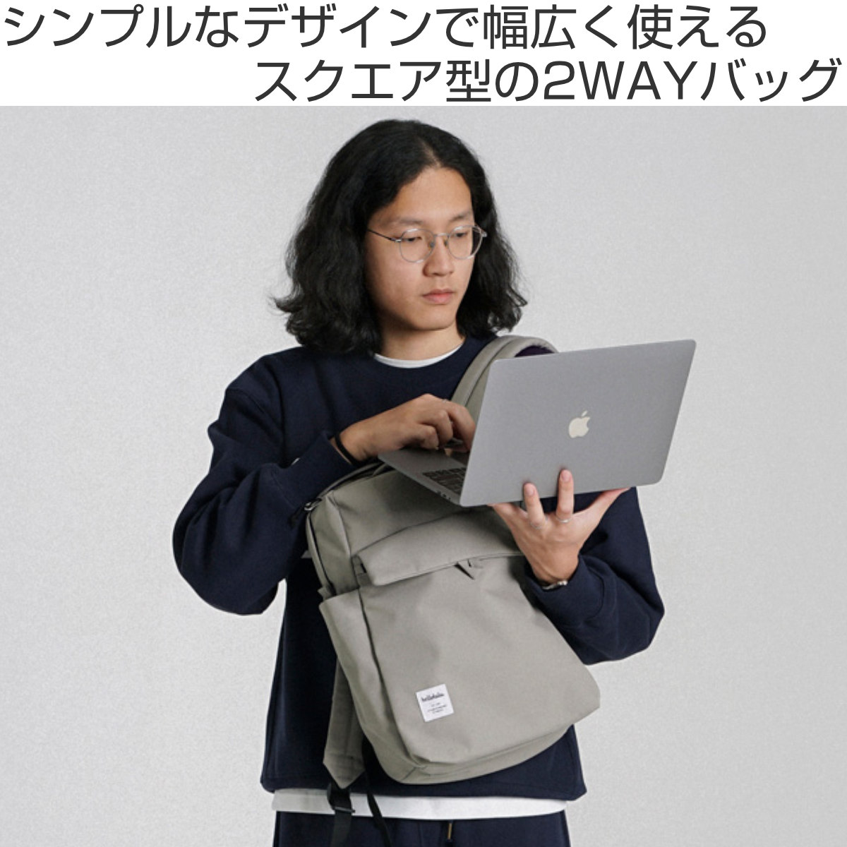 容量約13Lとたっぷり入るスクエア型のバックパックです。持ち手が付いた2WAY仕様なので、背負わない時も持ち運びしやすいです。16インチのノートPCが入る大きさなので、普段使いから通勤通学まで幅広く使えます。