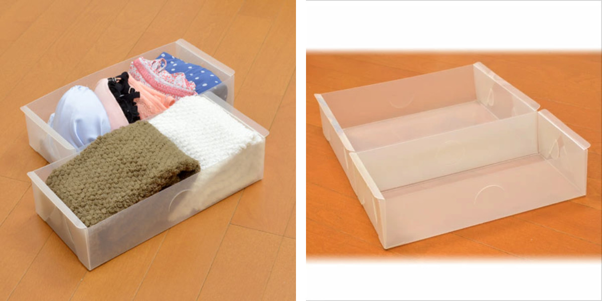 | 大切な衣類収納にピッタリサイズ ブラジャーのような型崩れさせたくないデリケートな衣類などの収納に。種類別に収納できるうれしい2個組みです。 | 仕切りケース同士連結できます 引出し内でズレずに便利。 |