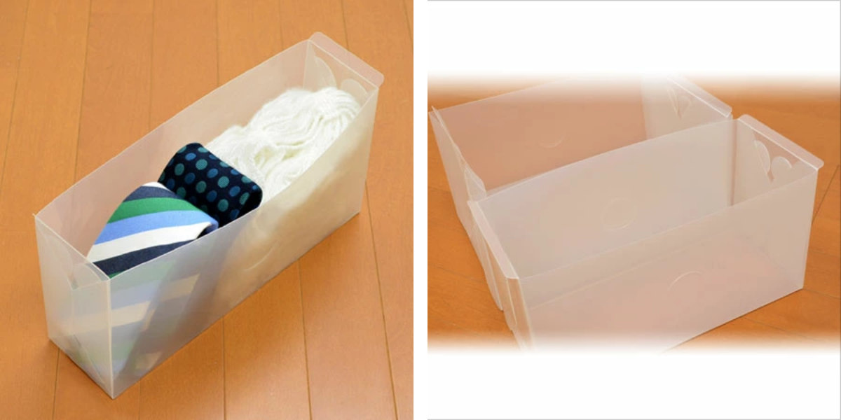 | 小さな衣類収納にピッタリサイズ 靴下やハンドタオル、アンダーウェア、ネクタイなどの収納に。 | 仕切りケース同士連結できます 衣装ケース内でズレずに便利(画像はイメージ)。 |