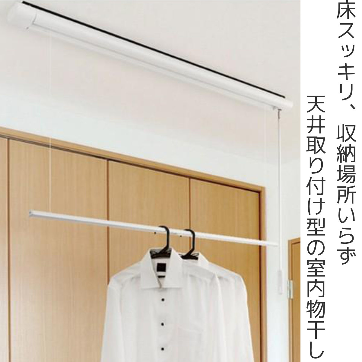 床スッキリ、収納場所いらずの天井取付物干し手軽で便利な床置き式物干しですが、物干しを置くとどうしても床が狭くなったり、使わないときの収納場所が必要になったり。