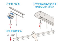 簡単操作で使いやすい操作棒でお好みの高さに調整して使用できます。竿を使用しないときは、操作棒は取り外して付属フックで壁にすっきり収納できます。竿を少し引き下げ、手を離すと竿が本体に収納されます。
