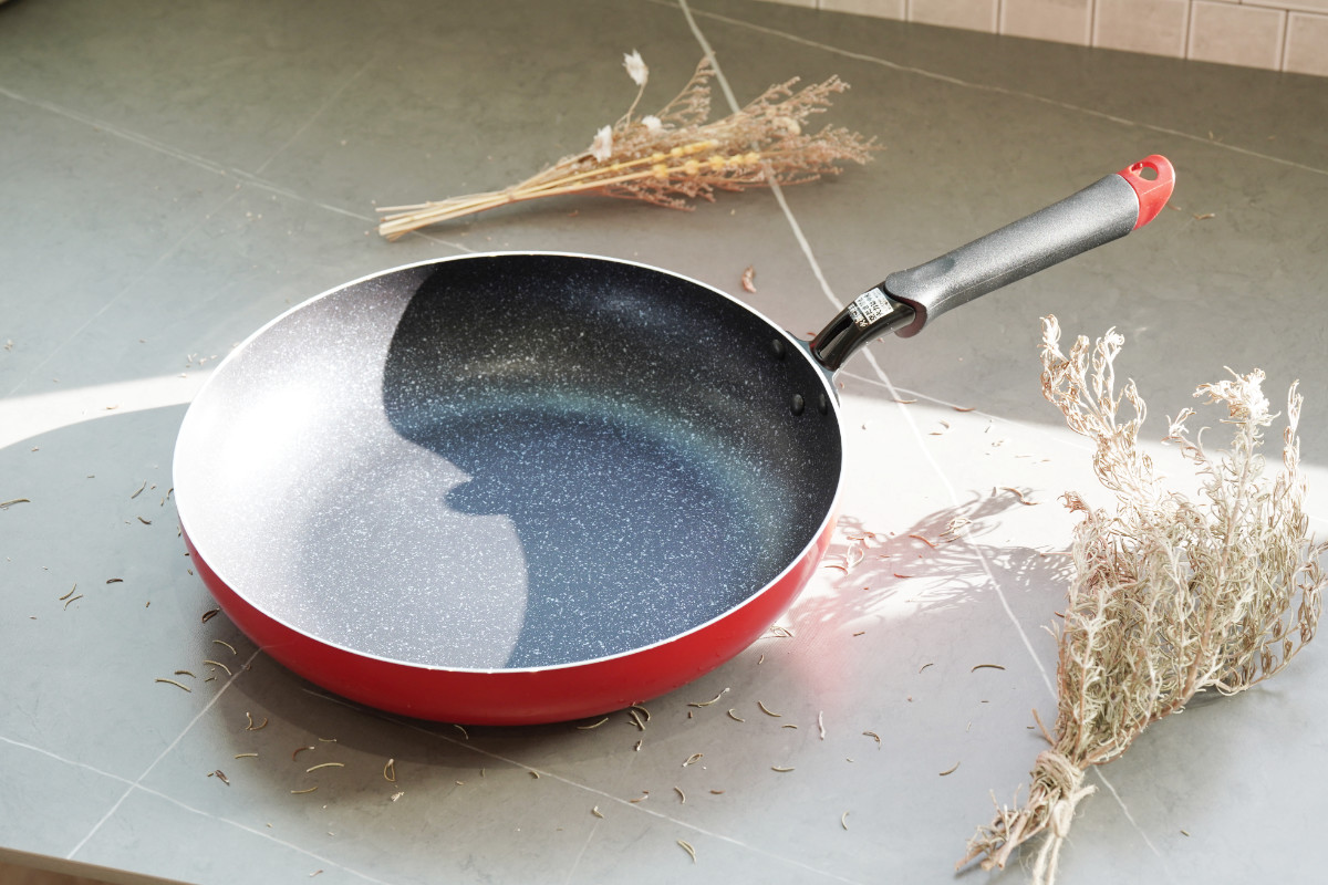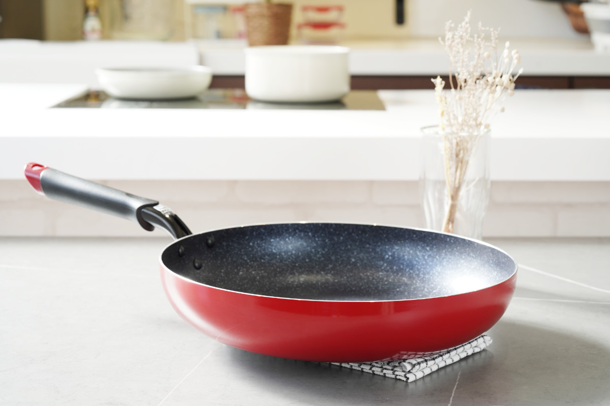 赤色の大きなフライパンは、調理中だけでなく、使用していないときでもキッチンの主役になります。鮮やかな赤の背景によって、焼き魚やステーキ、彩り野菜の色がいっそう引き立ち、いつもの家庭料理がまるでレストランの一皿のように格上げされます。