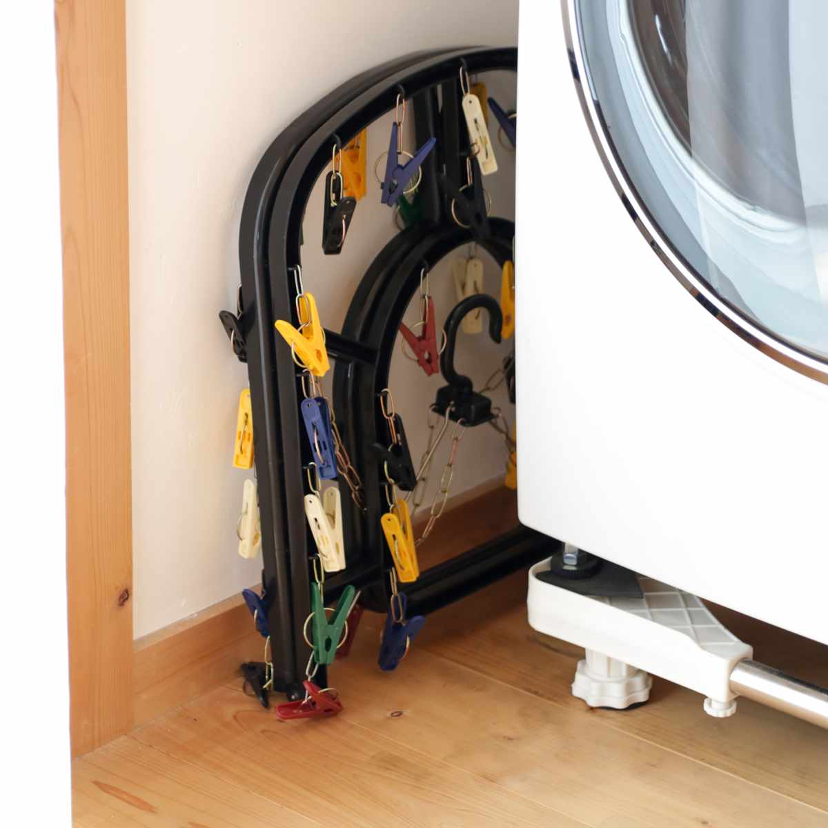 使用しない時は折りたたんで洗濯機横のスペースなどに、コンパクトに収納できます。ピンチが絡みにくい谷折り式なので、開閉時もスムーズです。