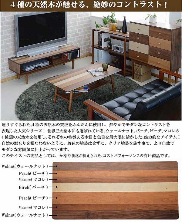 ●選りすぐられた4種類の天然木のントラストを楽しめるローテーブル(角型)です。