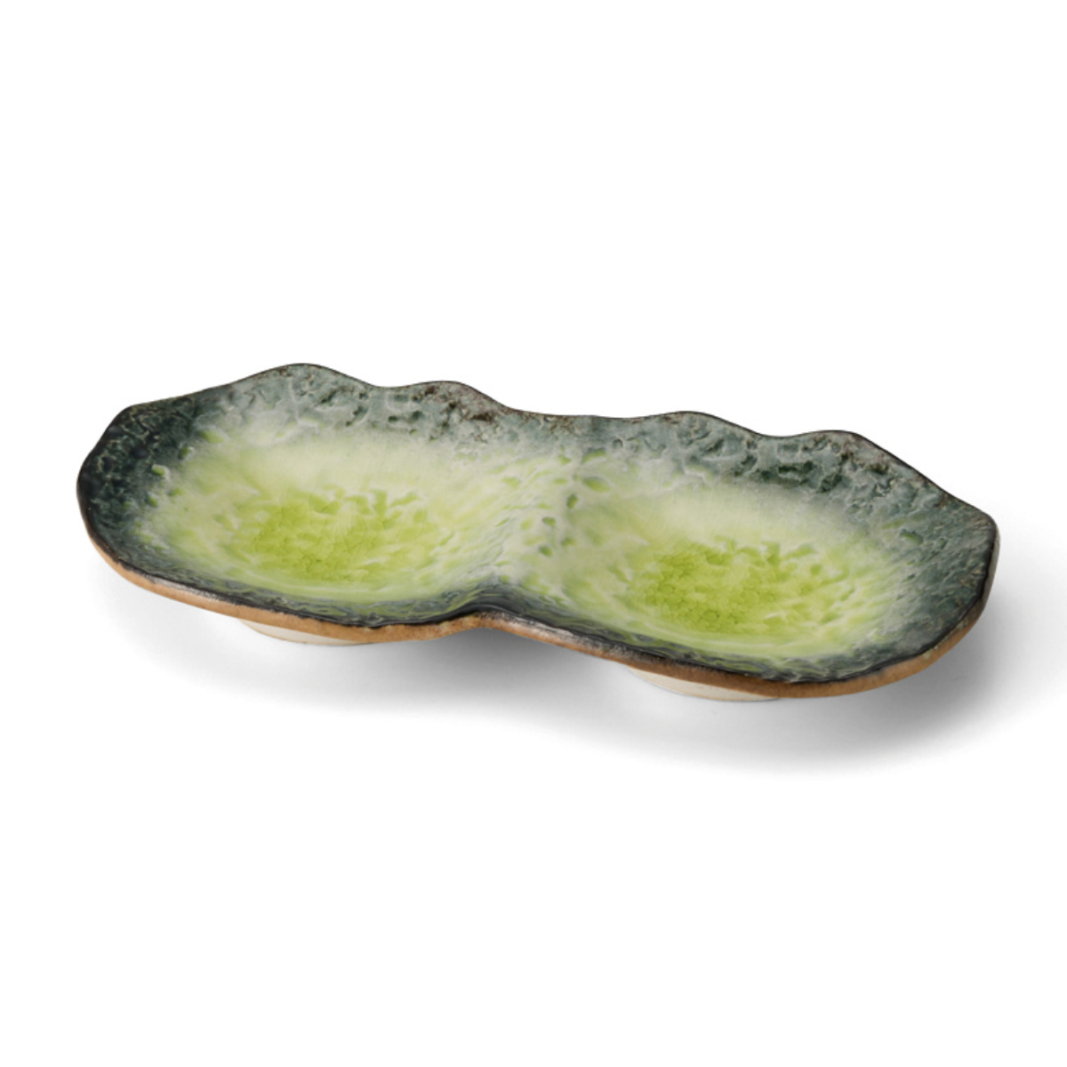 薬味やタレ等を盛り付けるのにぴったりな2連の小皿です。釉薬の溜まりに味わいを感じ、器の鮮やかな色彩が食材を引き立ててくれます。