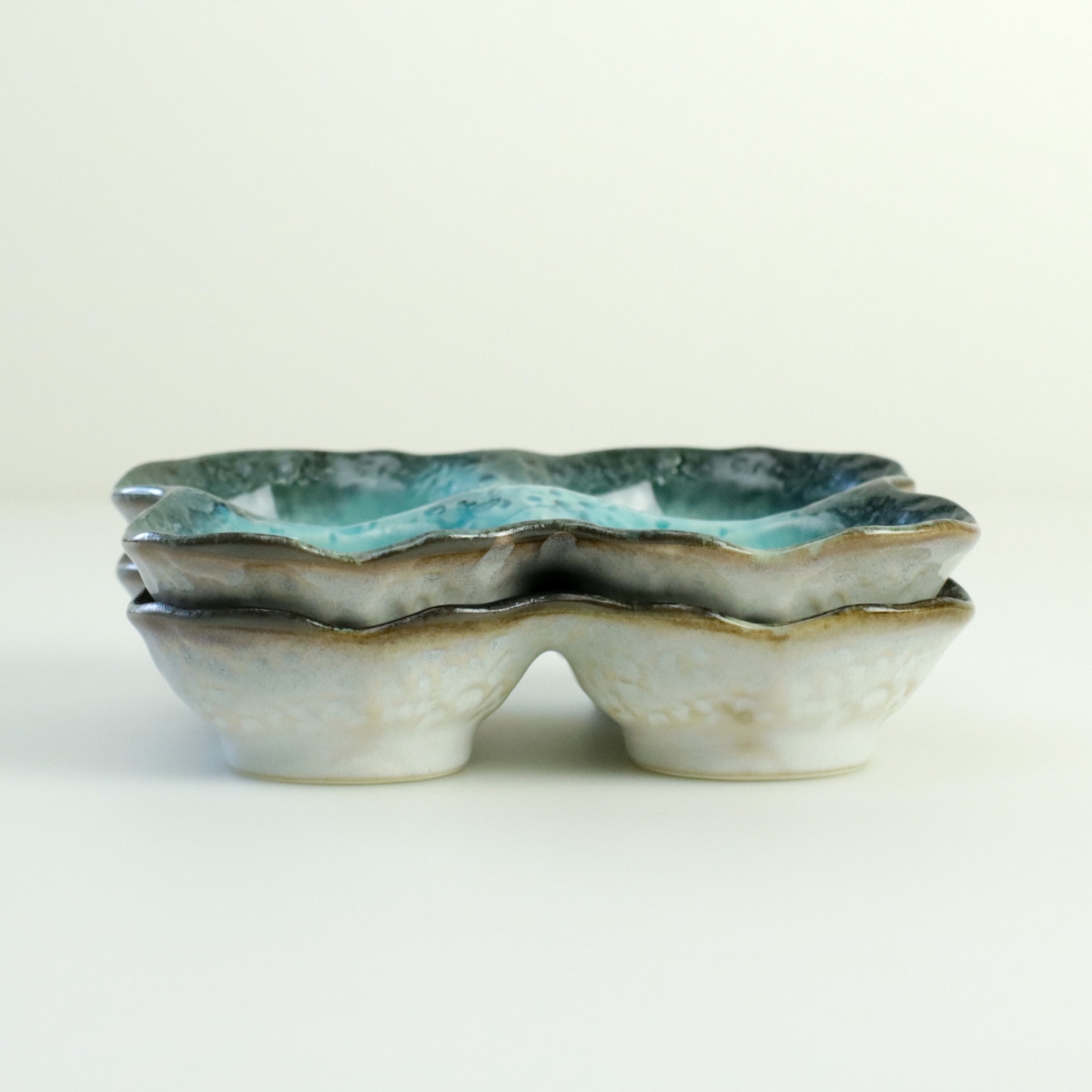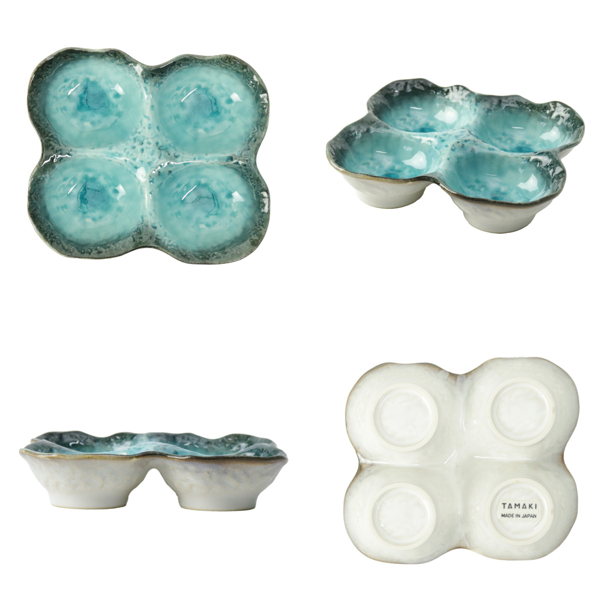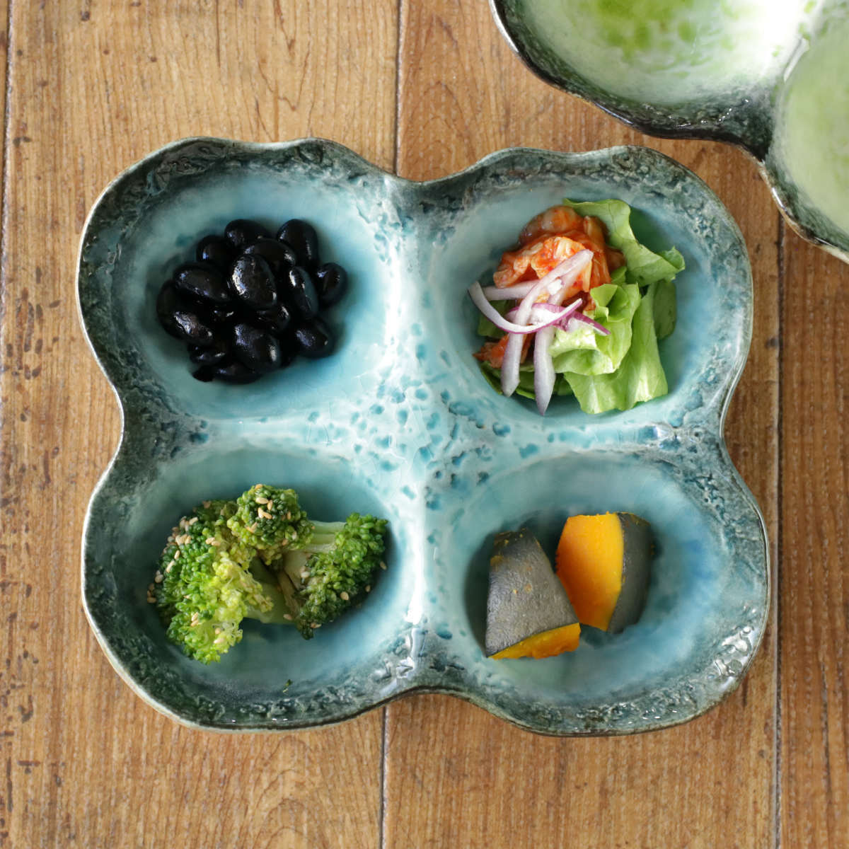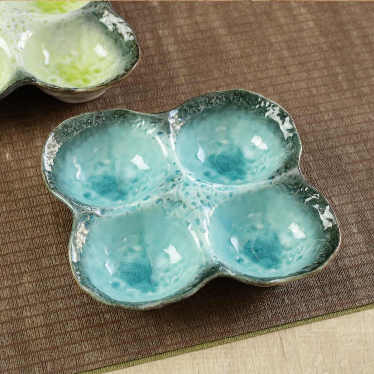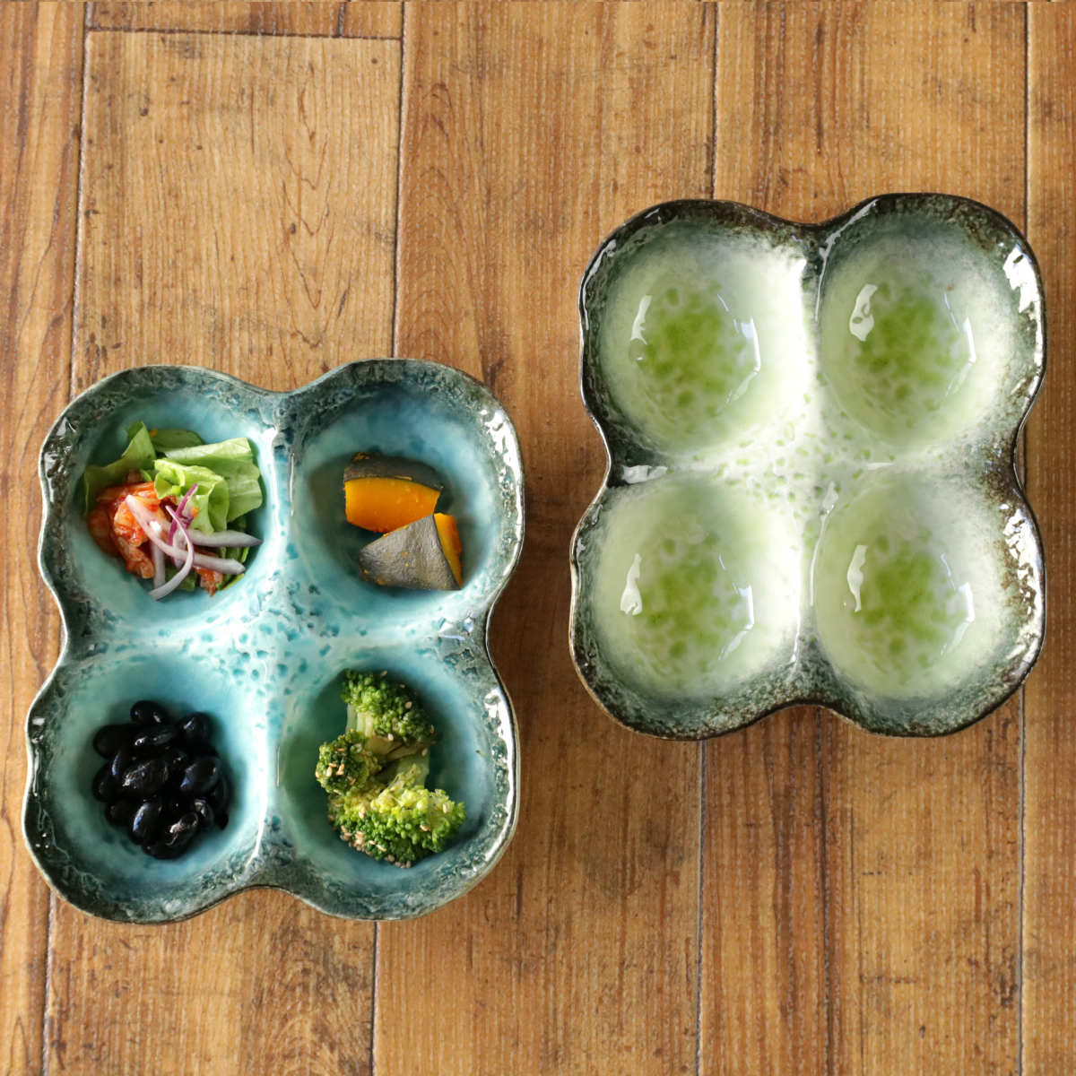 小鉢四種盛りやビュッフェの取り分け皿にぴったりサイズの便利な4連型の小鉢です。釉薬の溜まりに味わいを感じ、器の鮮やかな色彩が食材を引き立ててくれます