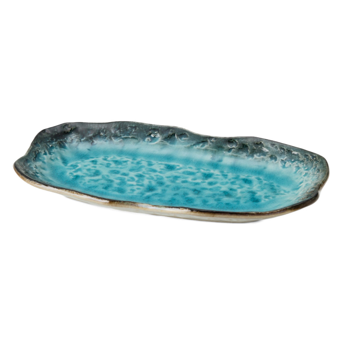お刺身や焼き魚などを盛り付けるのにぴったりなサイズの長皿です。釉薬の溜まりに味わいを感じ、器の鮮やかな色彩が食材を引き立ててくれます。