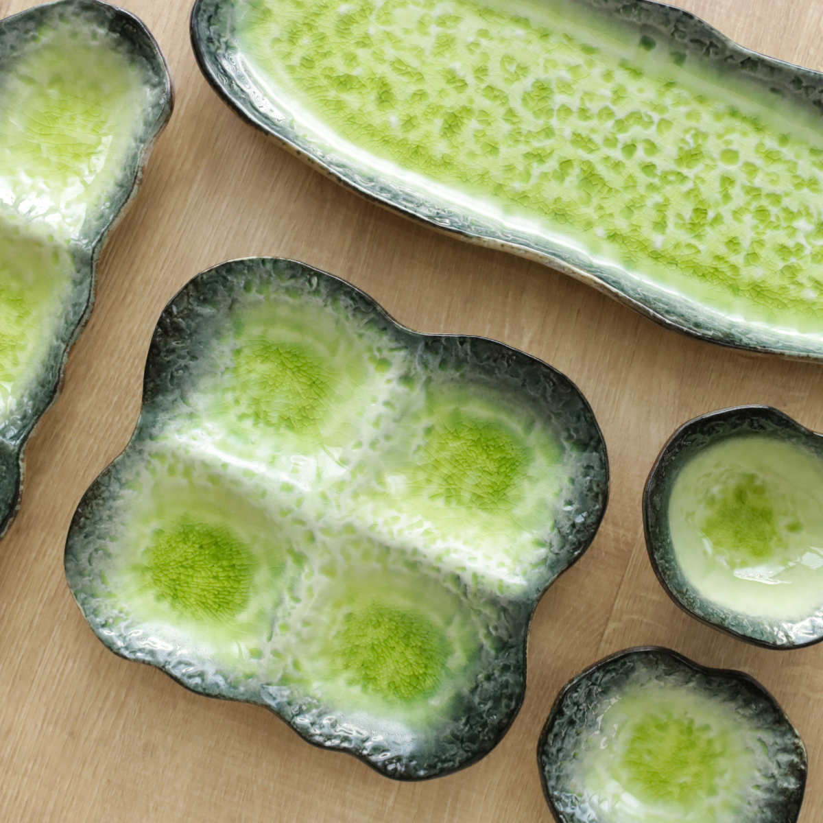 奥深い釉薬の溜まりがまるで澄んだ湖のように印象的なデザインです。和食はもちろん、洋食やエスニック料理でも、食材と器の鮮やかな色彩のコントラストが料理を引き立ててくれます。