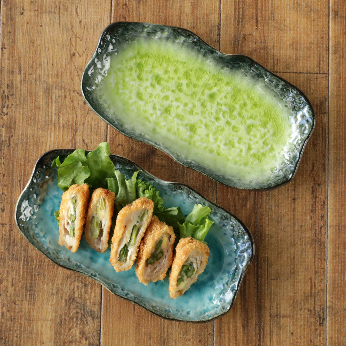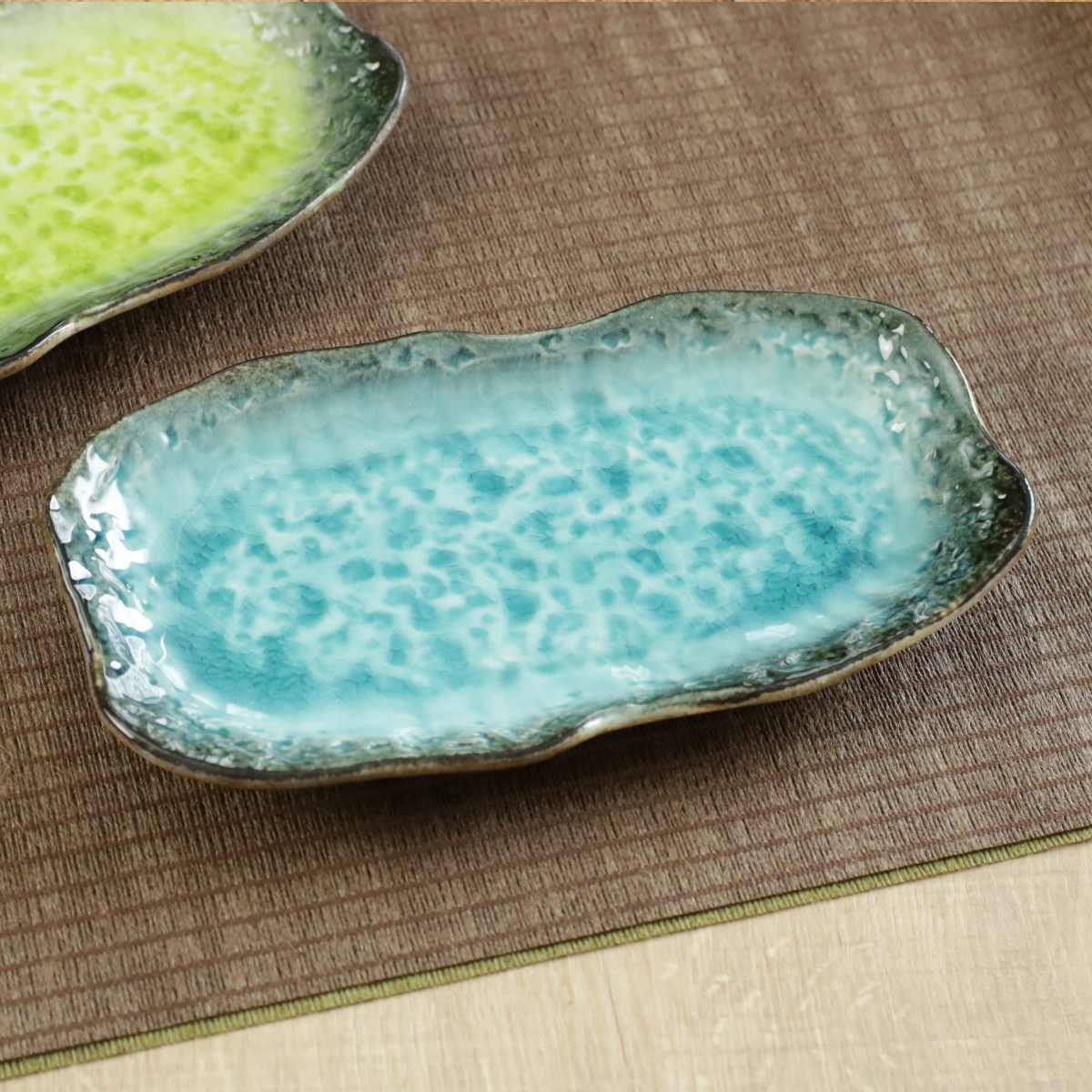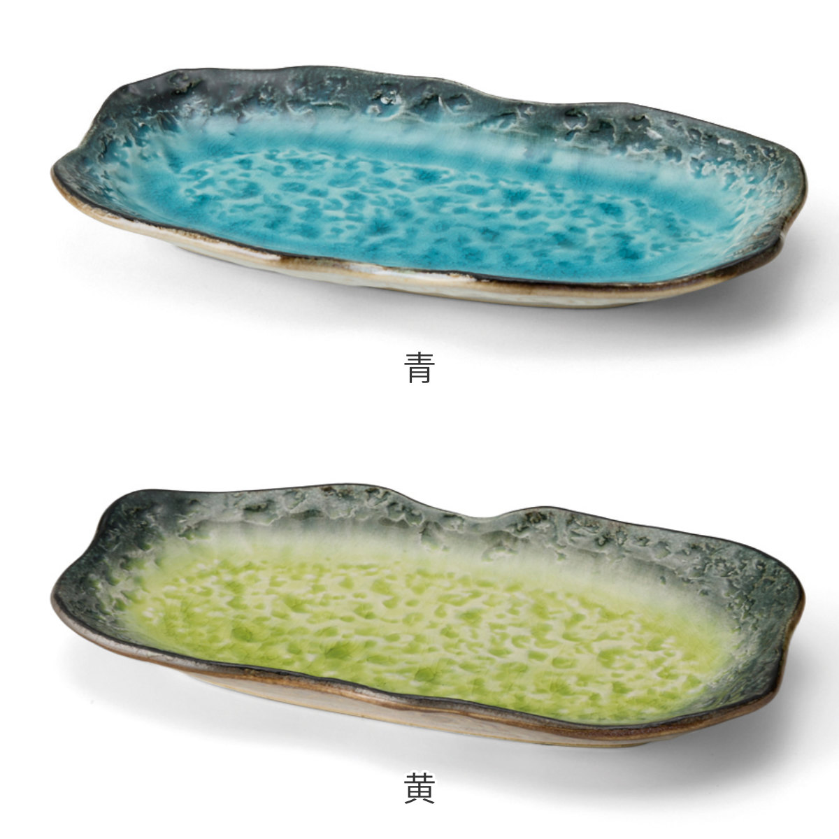 お刺身や焼き魚などを盛り付けるのにぴったりなサイズの長皿です。釉薬の溜まりに味わいを感じ、器の鮮やかな色彩が食材を引き立ててくれます。