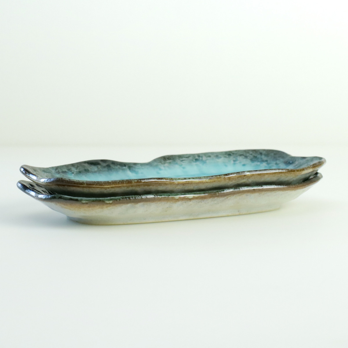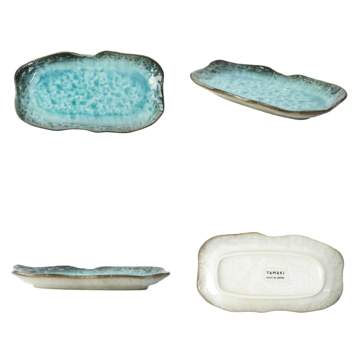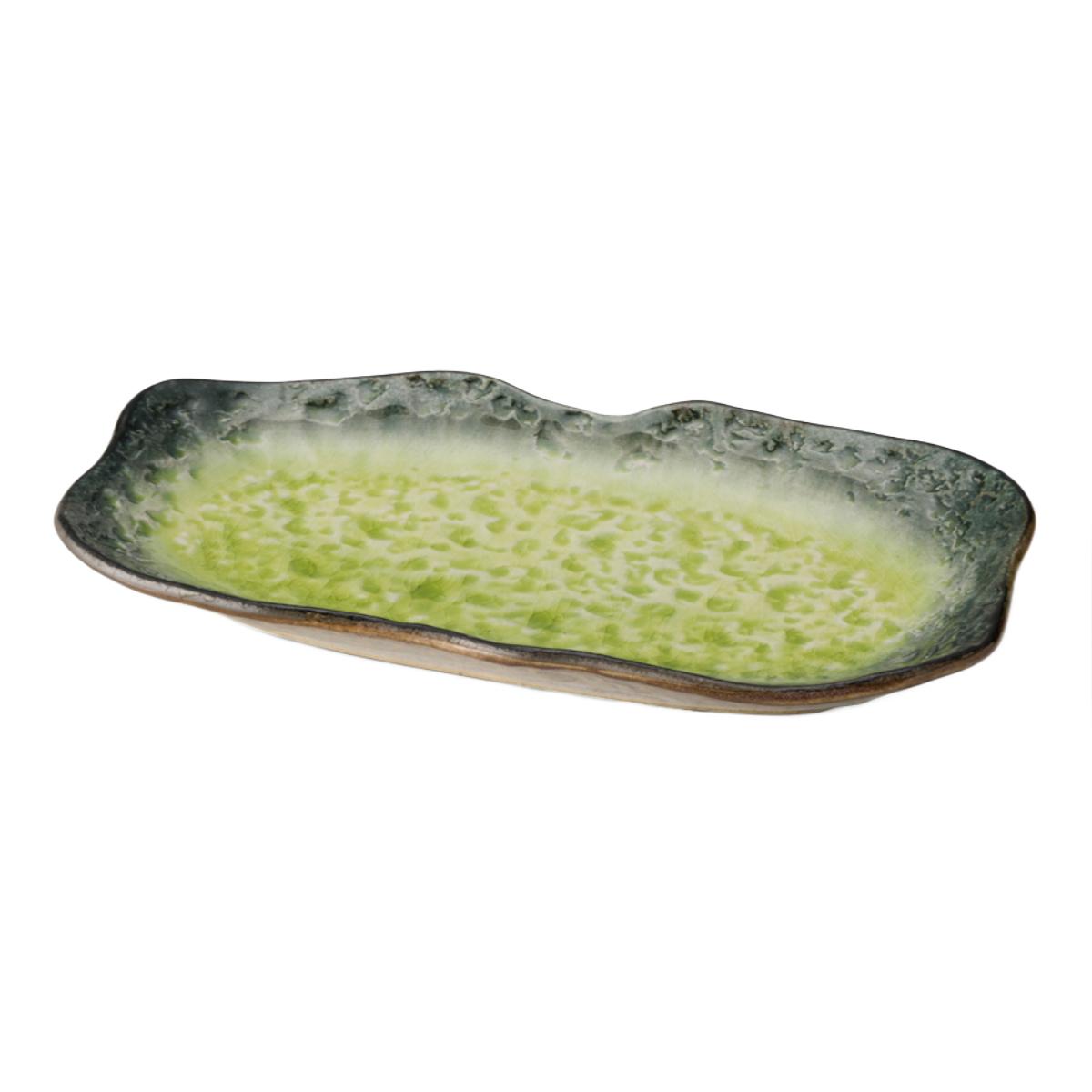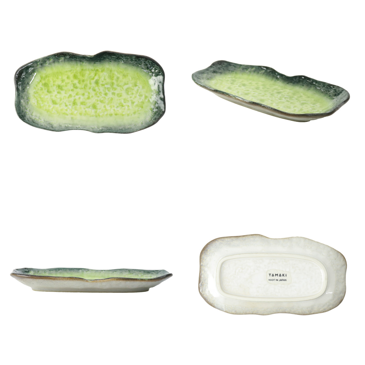 お刺身や焼き魚などを盛り付けるのにぴったりなサイズの長皿です。釉薬の溜まりに味わいを感じ、器の鮮やかな色彩が食材を引き立ててくれます。