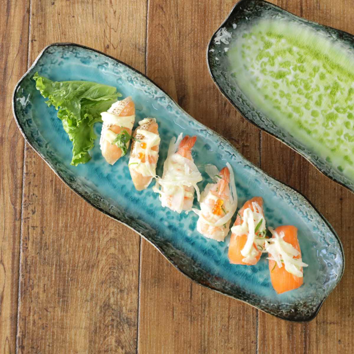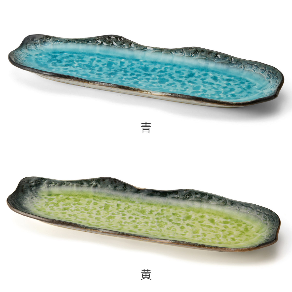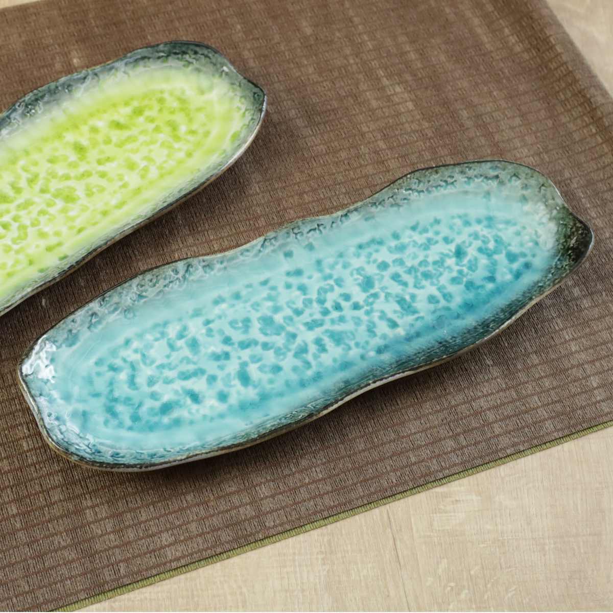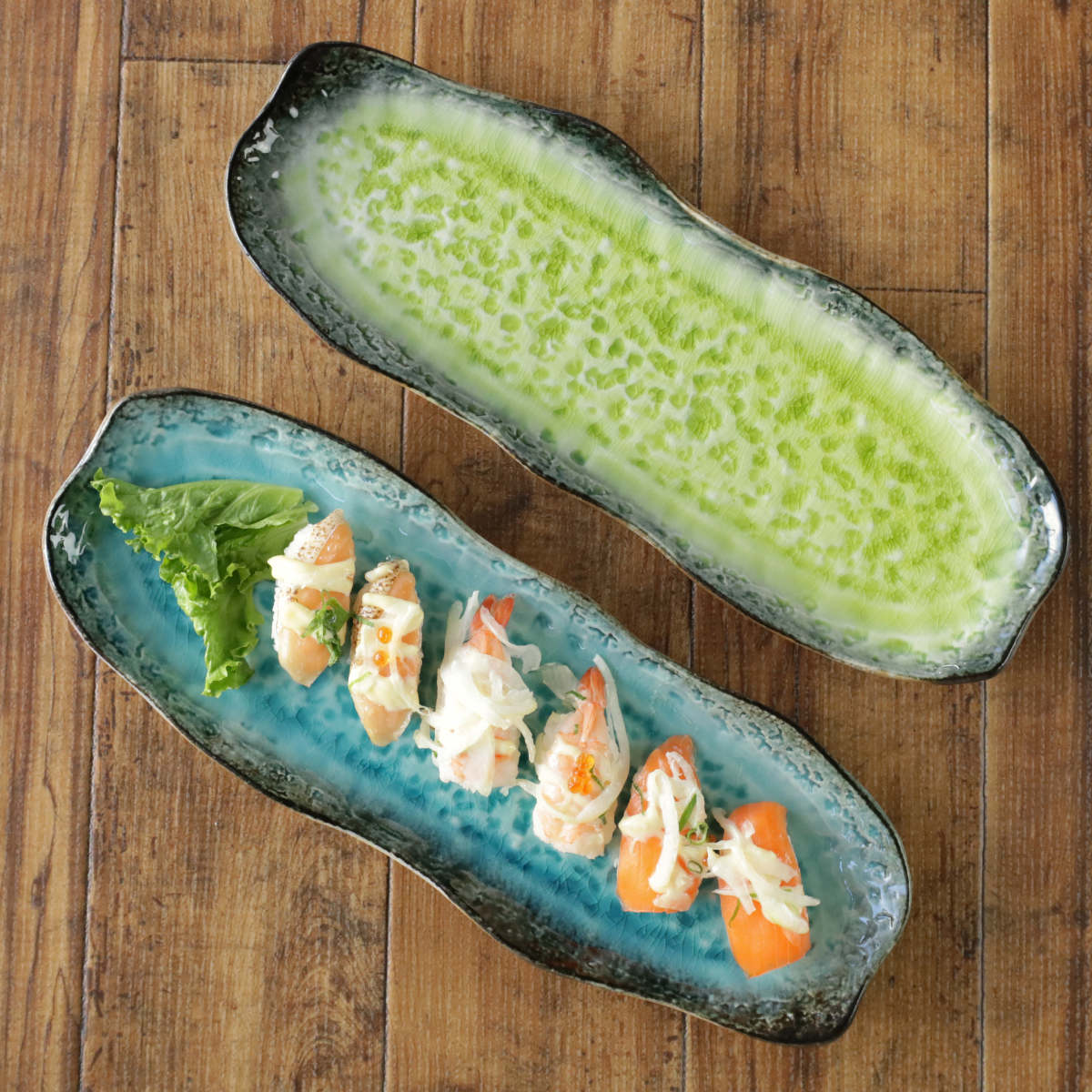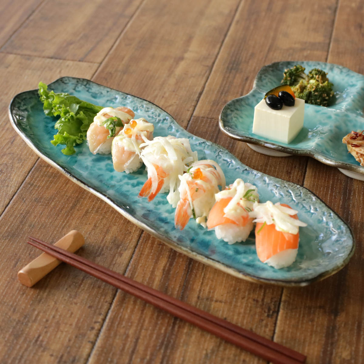 大皿としてカルパッチョやお寿司などを盛り付けるのにぴったりなサイズの長皿です。釉薬の溜まりに味わいを感じ、器の鮮やかな色彩が食材を引き立ててくれます。