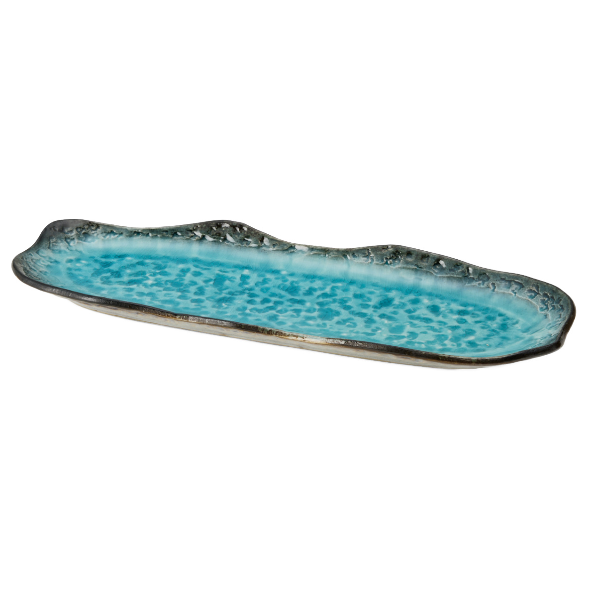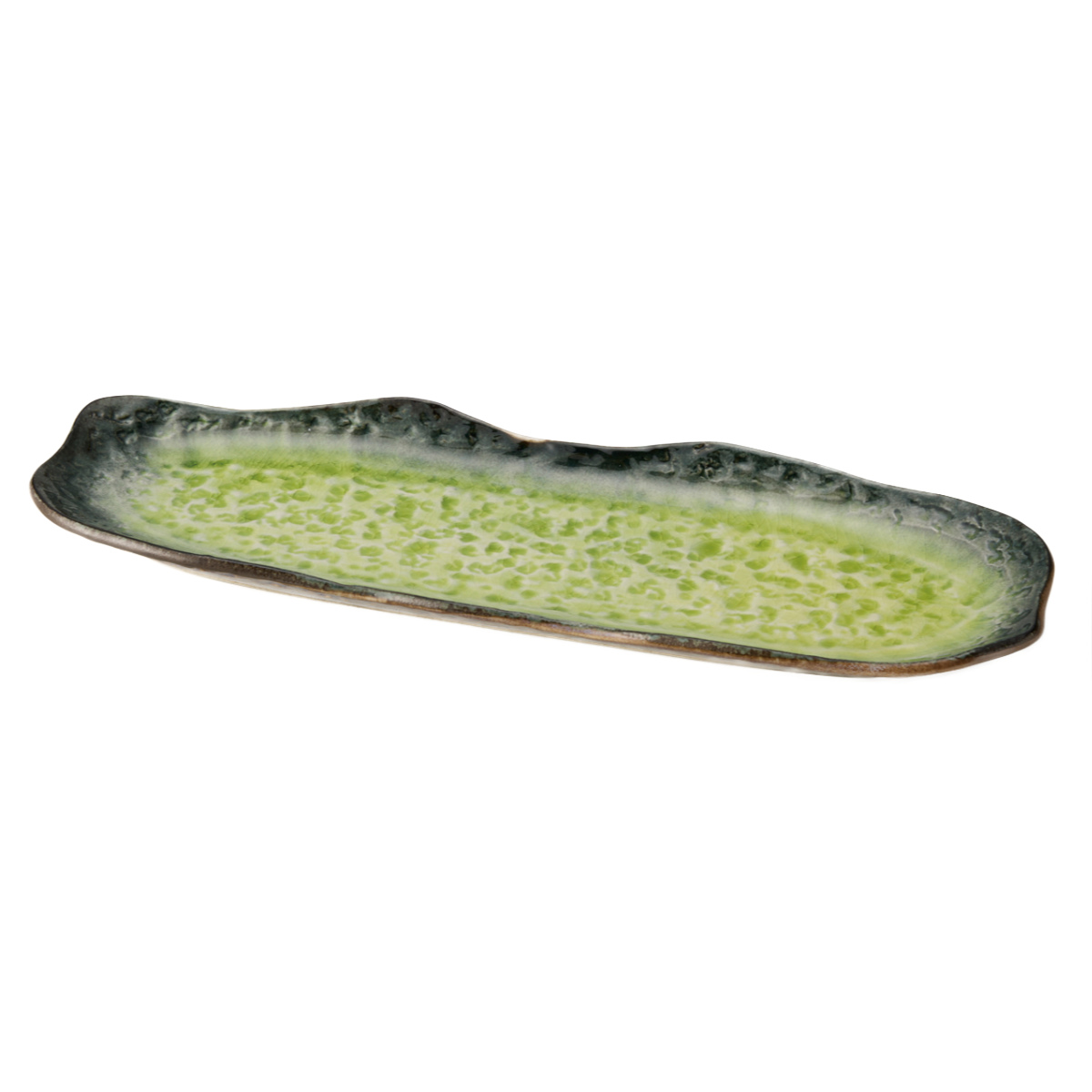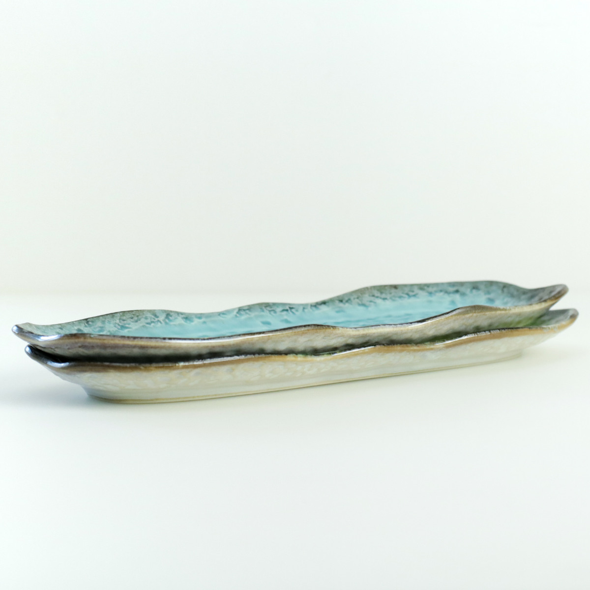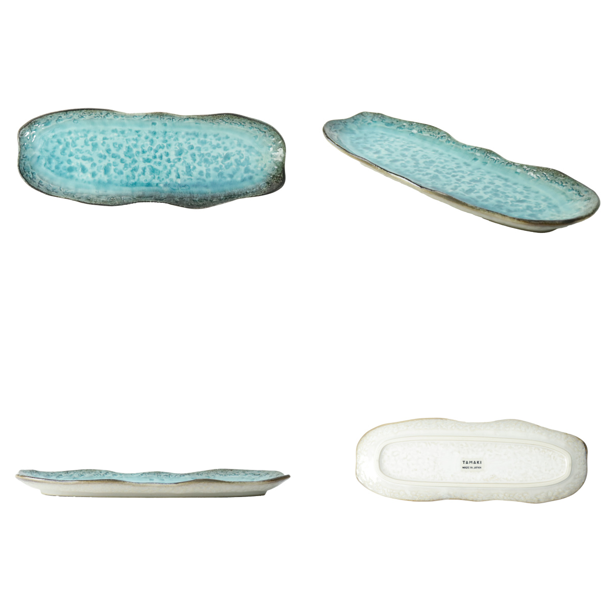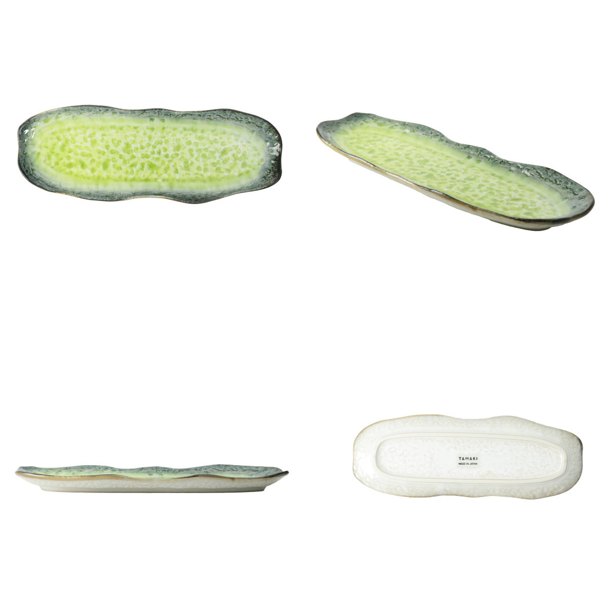 大皿としてカルパッチョやお寿司などを盛り付けるのにぴったりなサイズの長皿です。釉薬の溜まりに味わいを感じ、器の鮮やかな色彩が食材を引き立ててくれます。