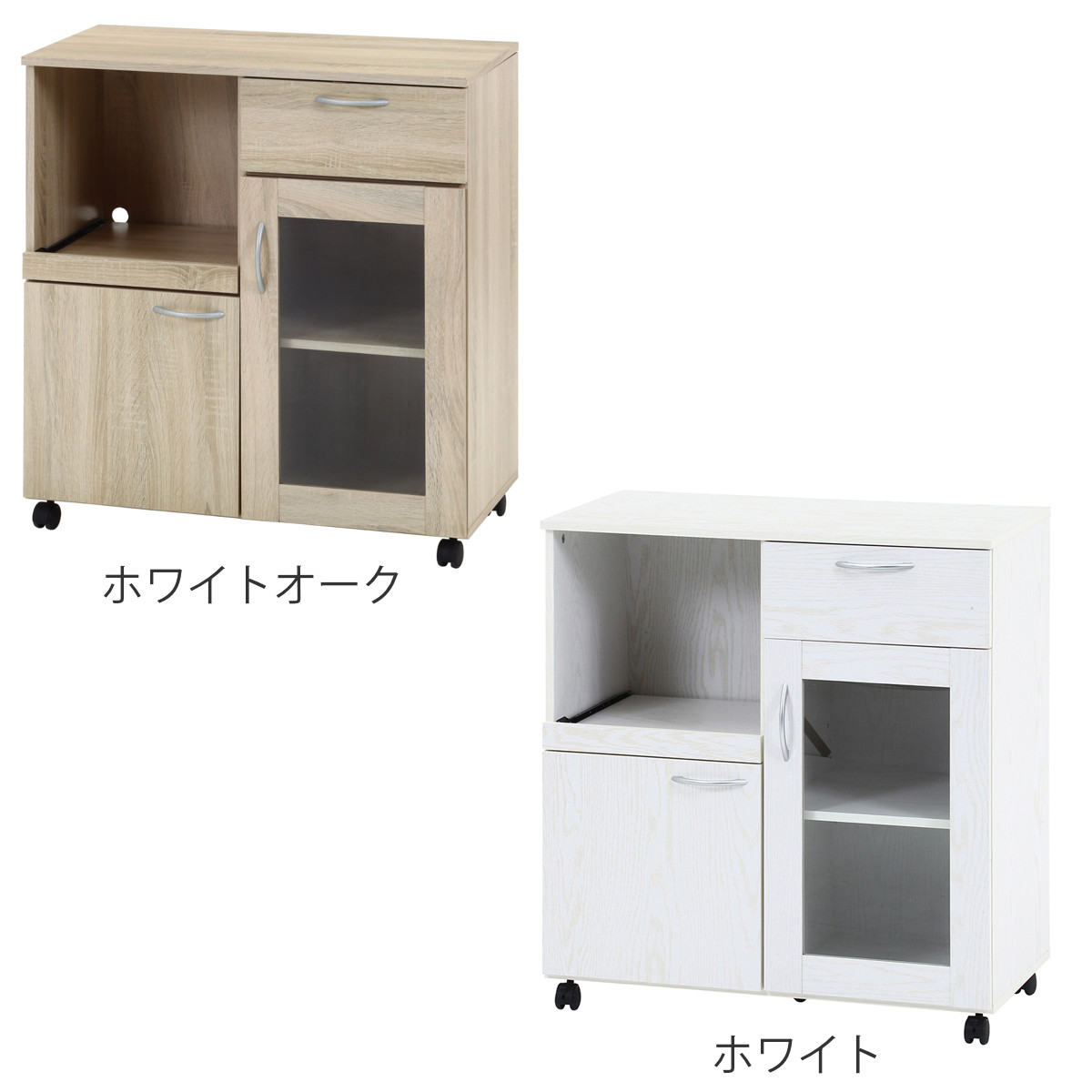 キッチンワゴン 幅76.8cm 高さ84cm 木目調 キャスター付 ( ワゴン キッチン収納 ラック 棚 ガラス扉 食器収納 家電収納 スライド棚 省スペース 可動棚 引き出し コンパクト シンプル ) 【ホワイト】