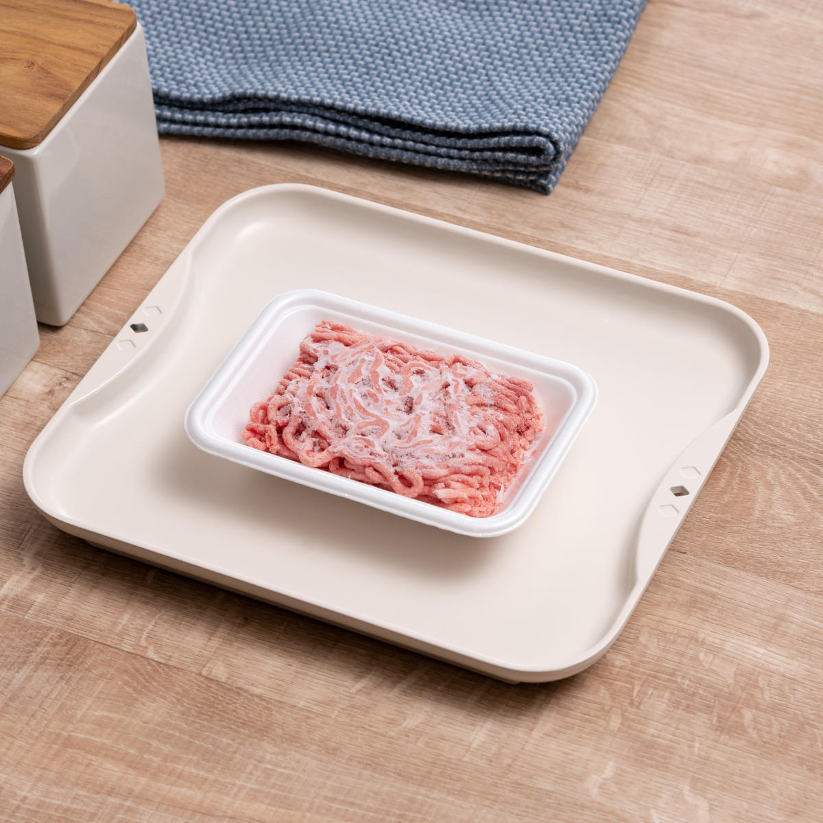 冷凍していたお肉や魚をすぐに使いたいけど、「電子レンジはムラができたり、加熱しすぎて失敗しやすい…」、「流水解凍はシンクが使えない、水がもったいない」などのお困りを解決する解凍プレート。