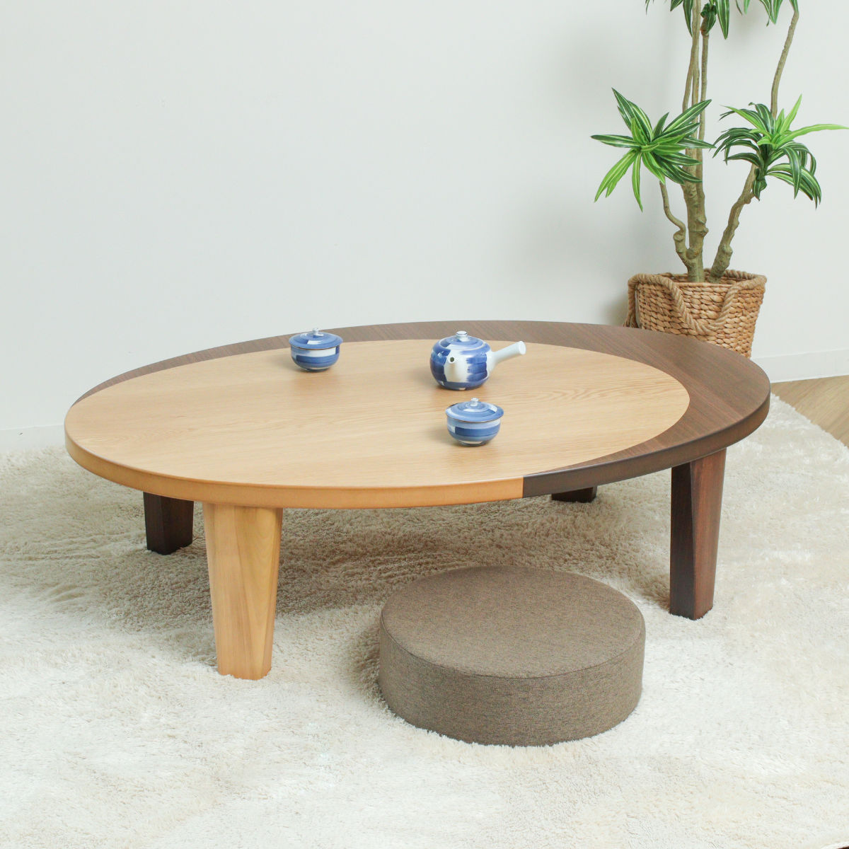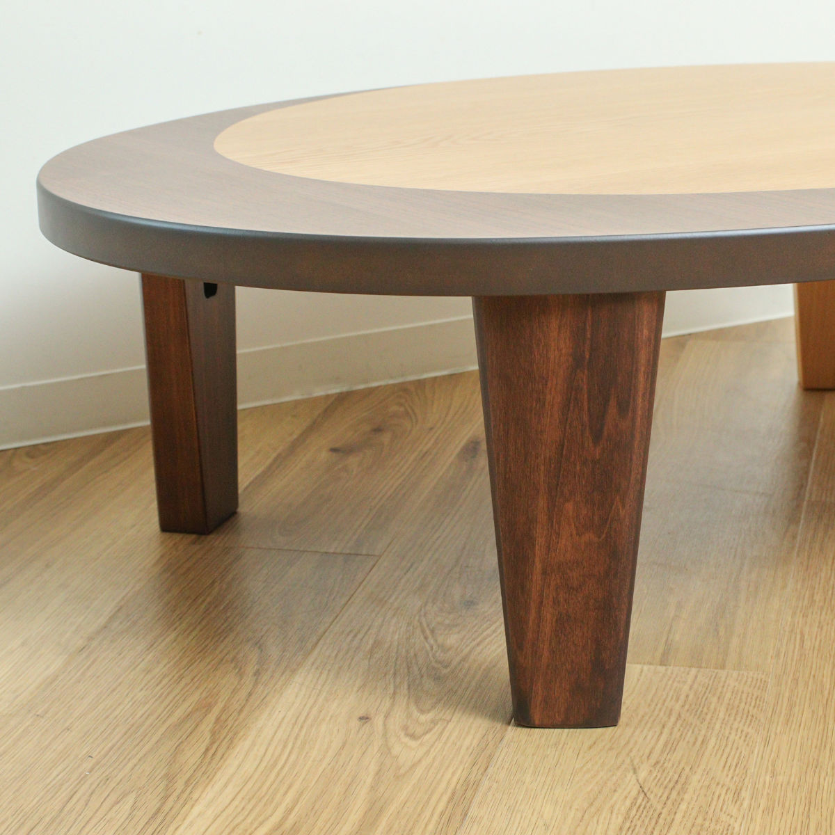 楕円形の天板に浮かぶ三日月模様が印象的な座卓です。明るいナラ材をベースに、深みのあるウォールナットを組み合わせることで、木目のコントラストと立体感が際立ちます。置くだけで空間を引き締める、上質なモダンデザインです。