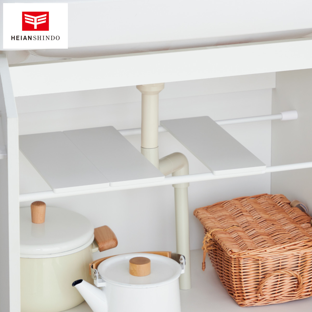 ●突っ張り棒2本にのせてシンク下やデッドスペースなどに棚を設置できるトレーです。
