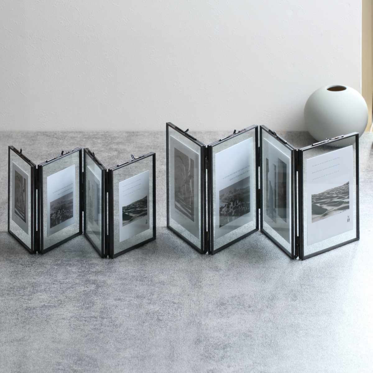 フォトフレーム MOR-02 ポストカード 4枚 ( フォトスタンド 写真立て 写真たて 複数枚 スタンド 多窓 多面 4窓 4枚収納 折りたたみ ガラス 真鍮 写真フレーム 写真入れ 写真 飾る アルバム 額縁 額 ベビー おしゃれ 収納 卓上 ) 【ブラック】