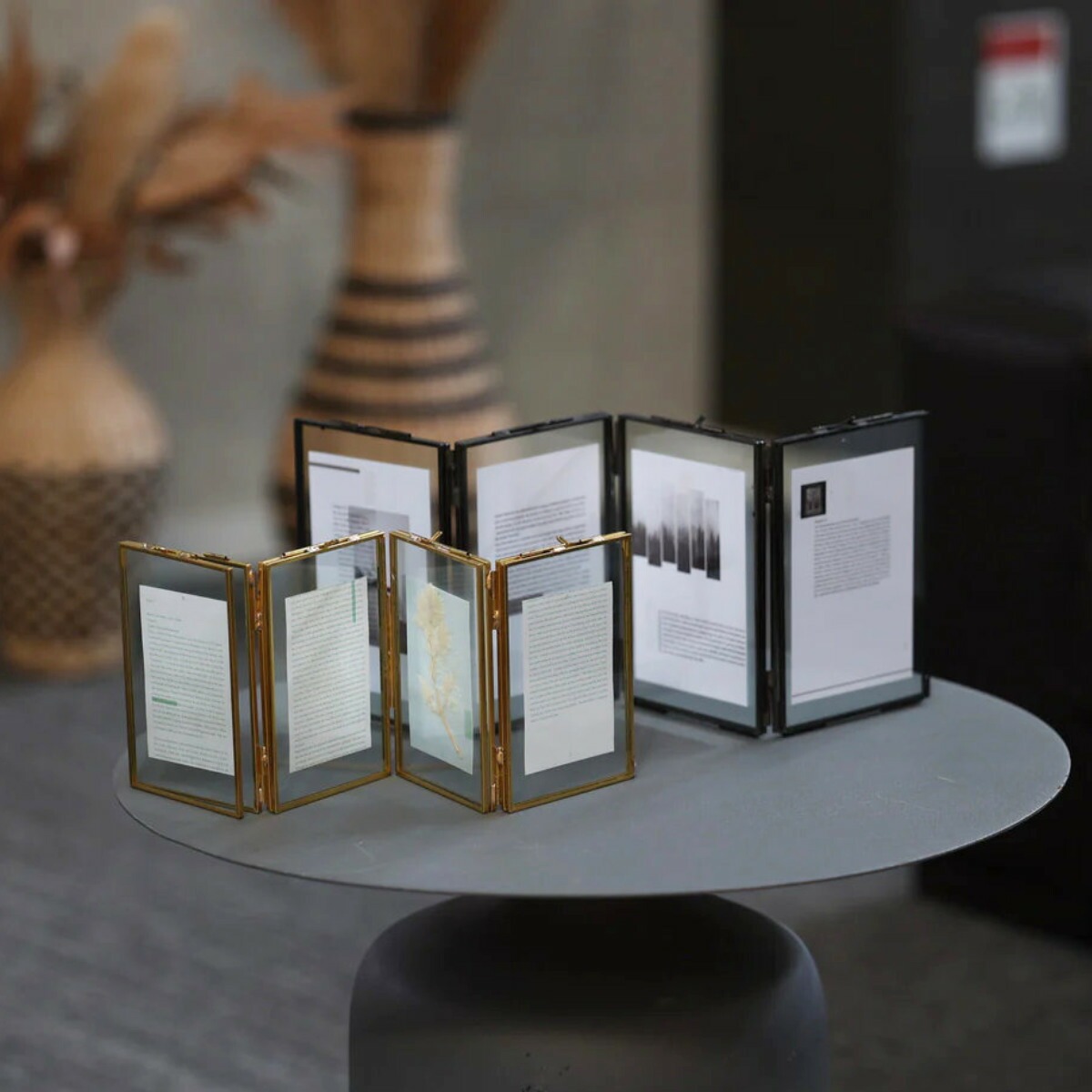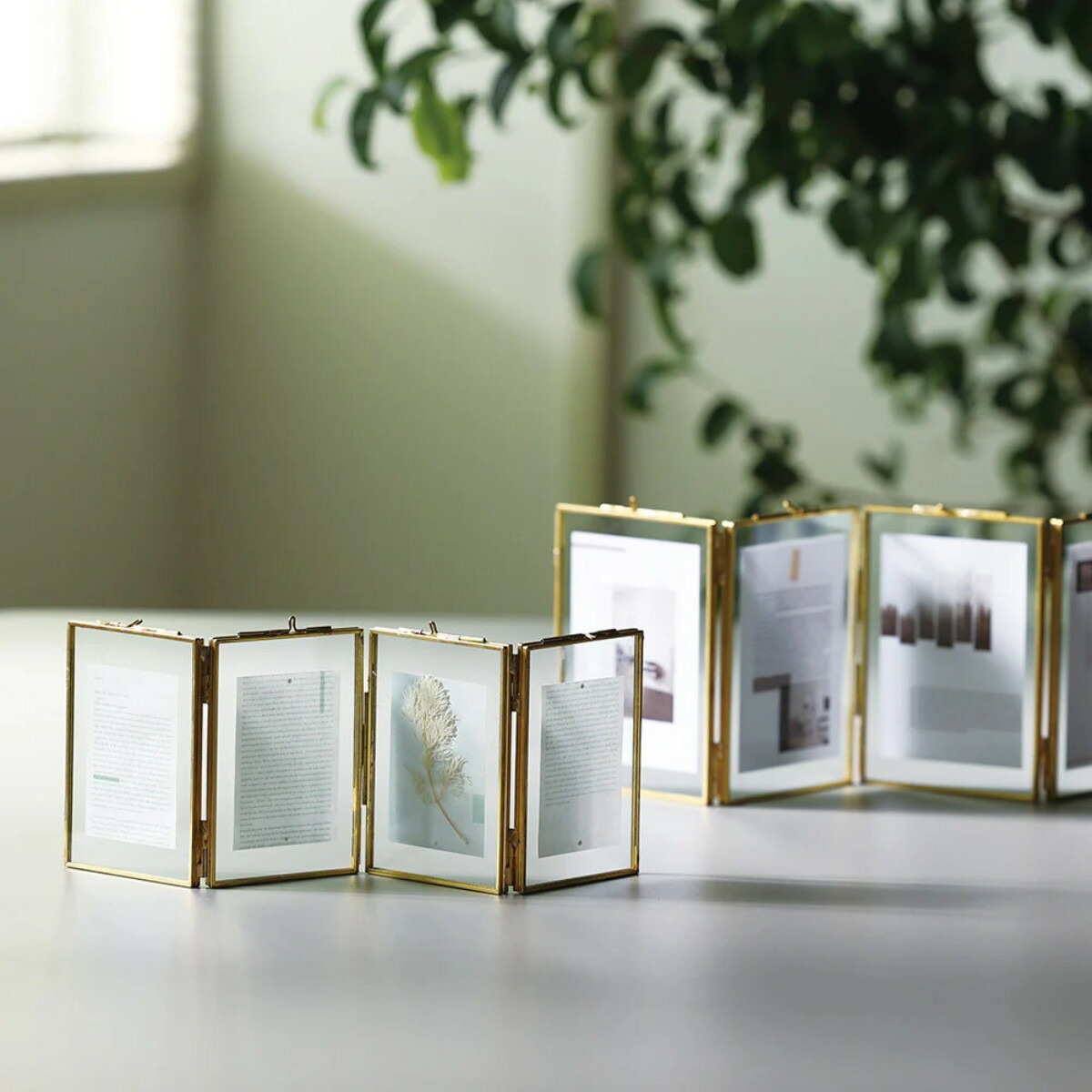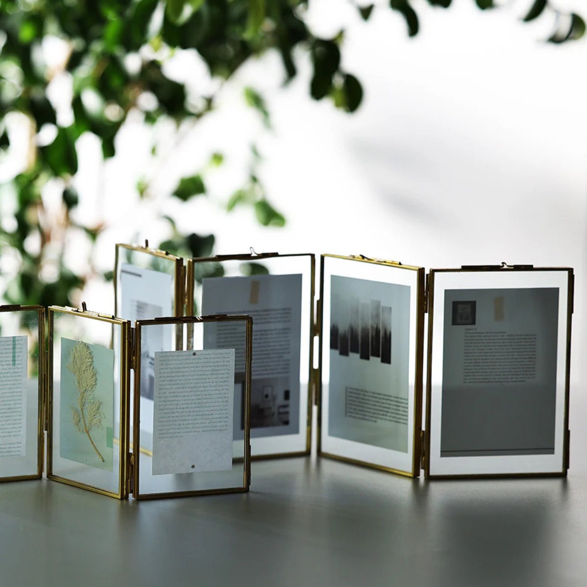 写真の他におしゃれなカードや押し花などを飾ってもおしゃれです。アクセントの真鍮フレームとガラス素材が都会的で、お部屋を美しく飾ります。