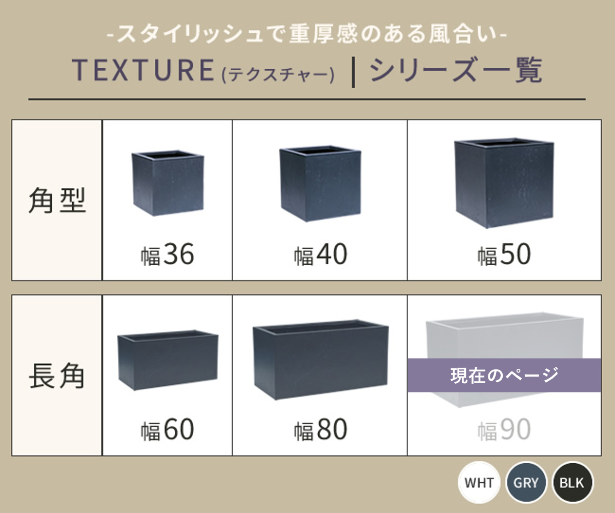 コンクリートの打ちっぱなし風の都会的な素材や、石等の自然素材の風合いを再現しています。上品でモダンなデザインは場所を選ぶことなく、植物と空間をスタイリッシュに演出します。