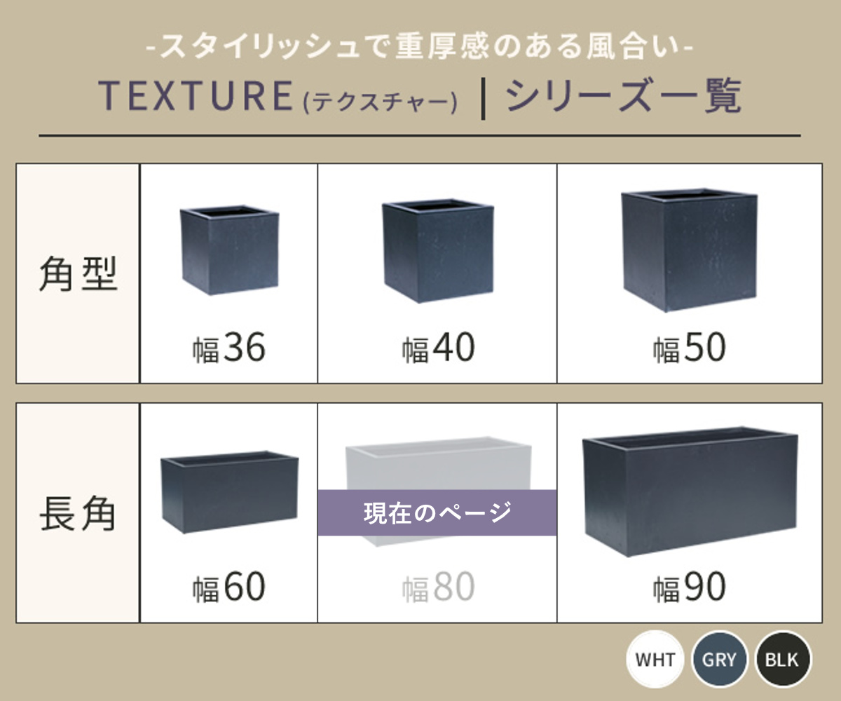 コンクリートの打ちっぱなし風の都会的な素材や、石等の自然素材の風合いを再現しています。上品でモダンなデザインは場所を選ぶことなく、植物と空間をスタイリッシュに演出します。