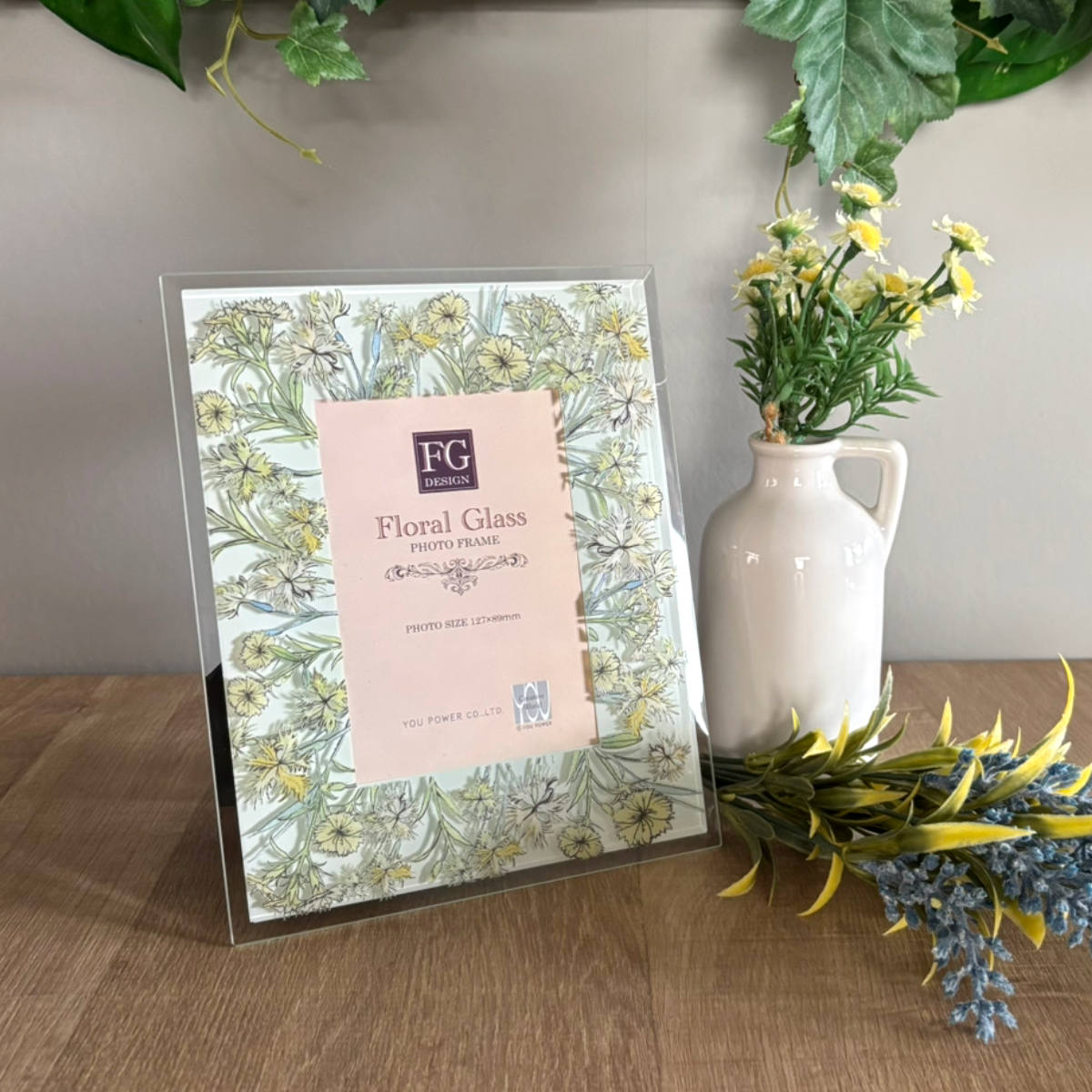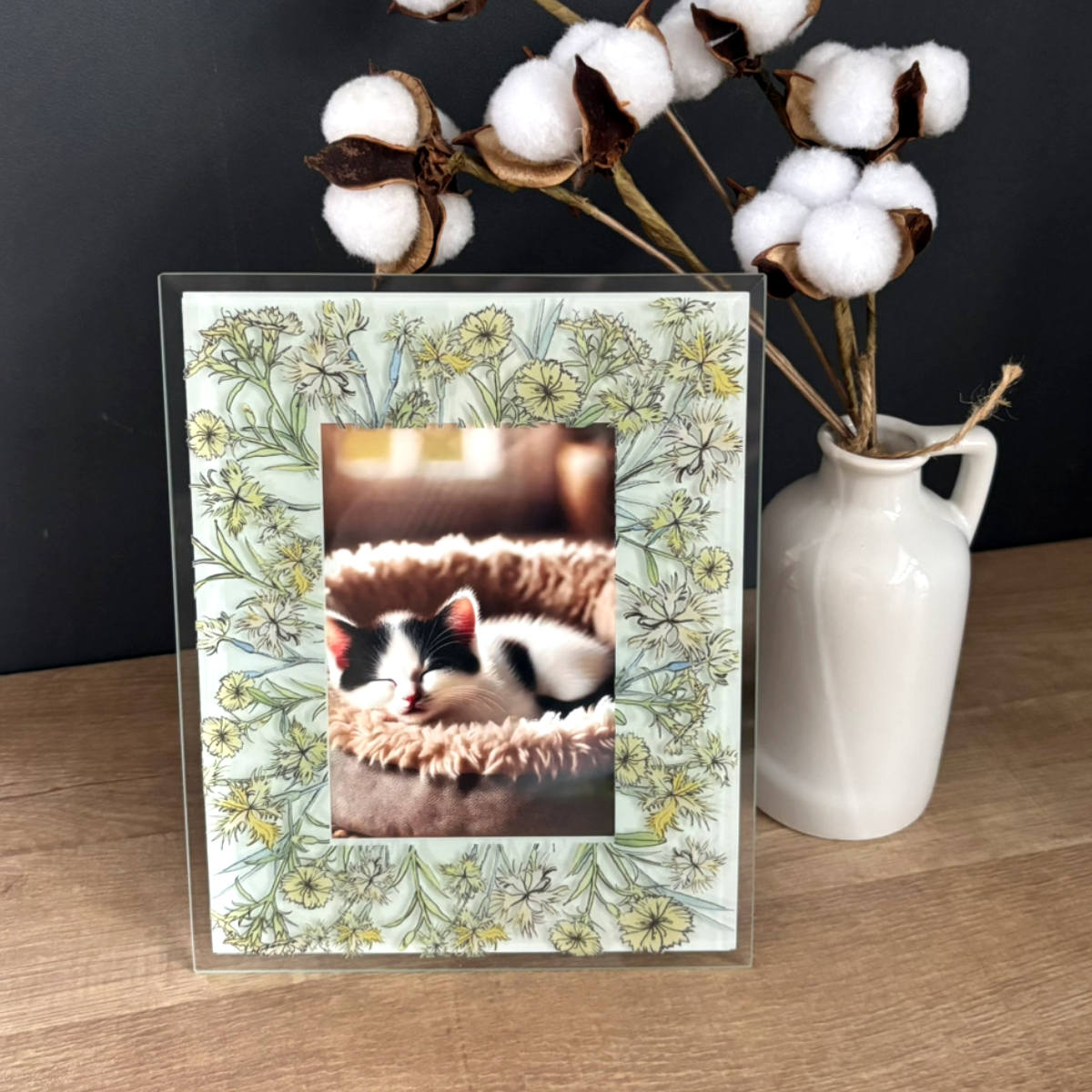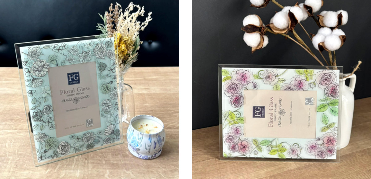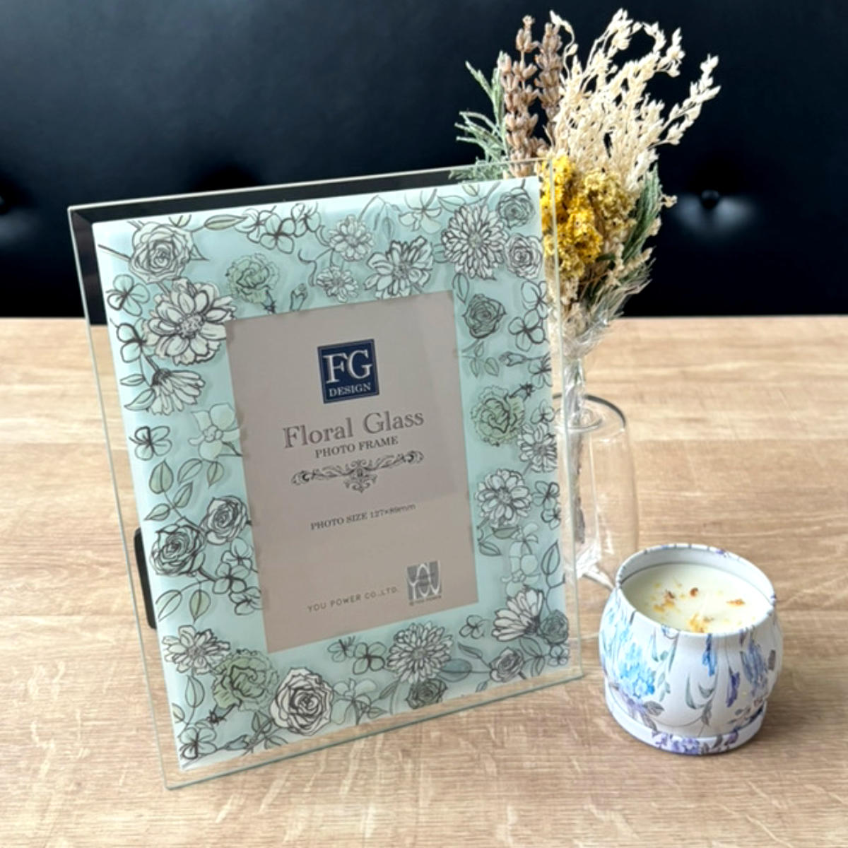 風に揺れる野花や植物を水彩画で可憐に描いた、ガラス製フォトフレームです。繊細な色遣いとガラスの透明感が優しく調和し、空間を華やかに彩ります。エレガントなデザインで、リビングや寝室、玄関など、さまざまな場所に馴染みます。