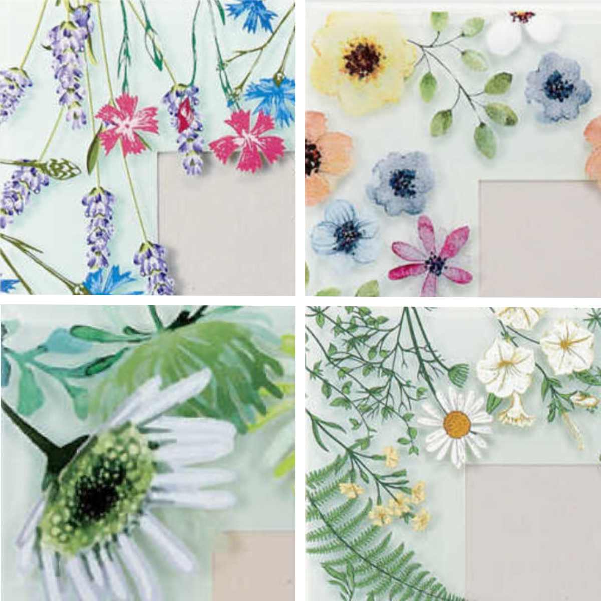 風に揺れる野花や植物を水彩画で可憐に描いたガラス製フォトフレーム。繊細な色合いと透明感が調和し、空間をやさしく華やかに彩ります。