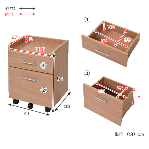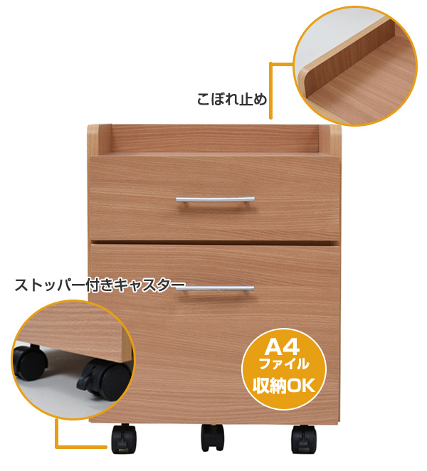 前方2つのキャスターはストッパーがついているから、チェストを固定できます。5個のキャスター付きで引き出しを開け閉めしても傾きません。引出しは2種類。上段→小物整理・下段→ファイルや書類の収納に便利です。