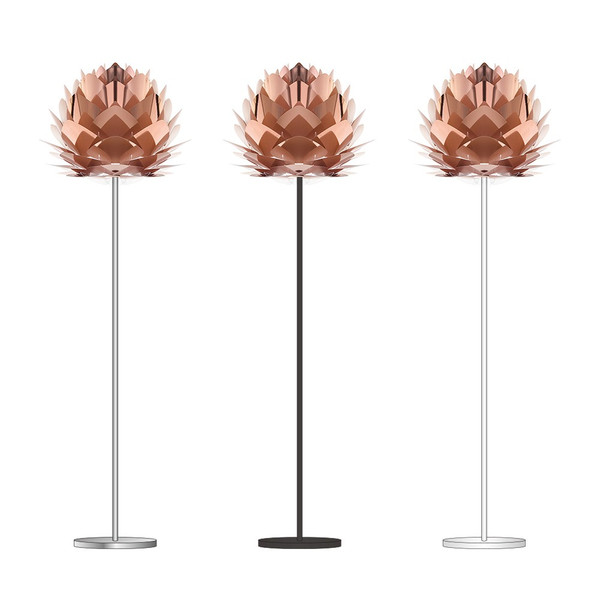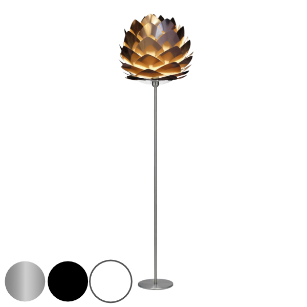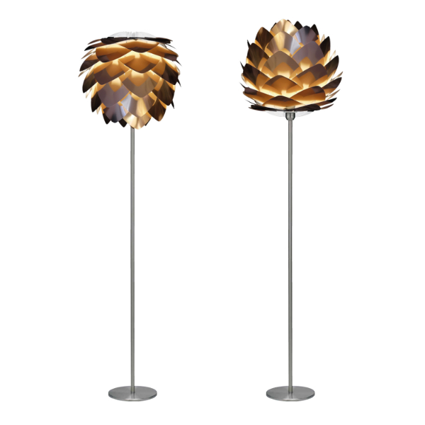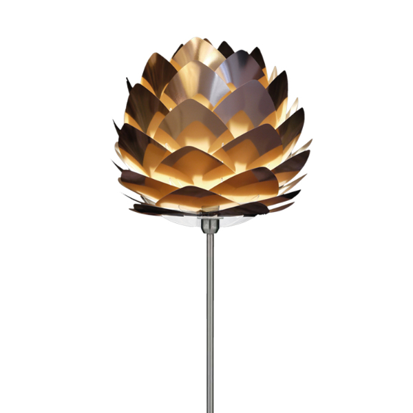 松ぼっくりのようなデザインが特徴です。現代的なセンスを感じる銅色の表面がメタリックで美しいトレンド感溢れる都会的なフロアライトです。シートの間から柔らかい光がもれて、お部屋が幻想的な雰囲気になります。