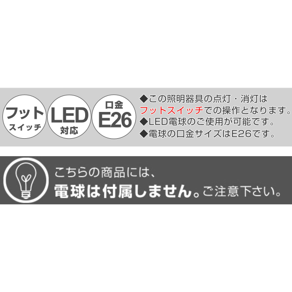 | 備考 | 【対応電球】 E26/60Wまで(1個) 電球型蛍光灯100W型 LED電球推奨 【取付方法】 フットスイッチ |