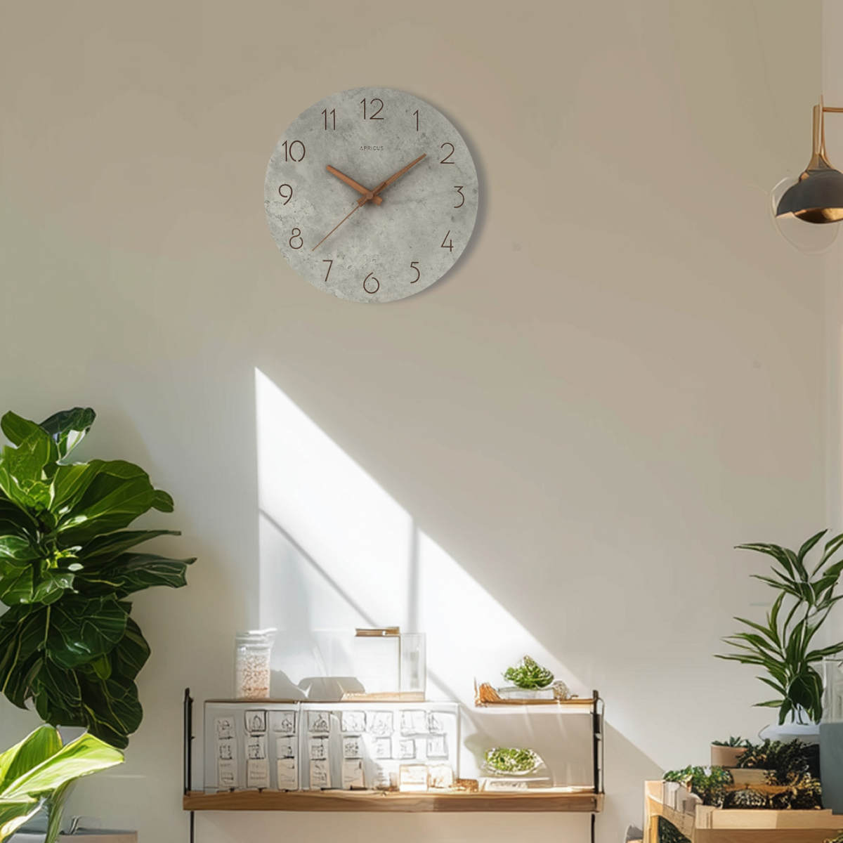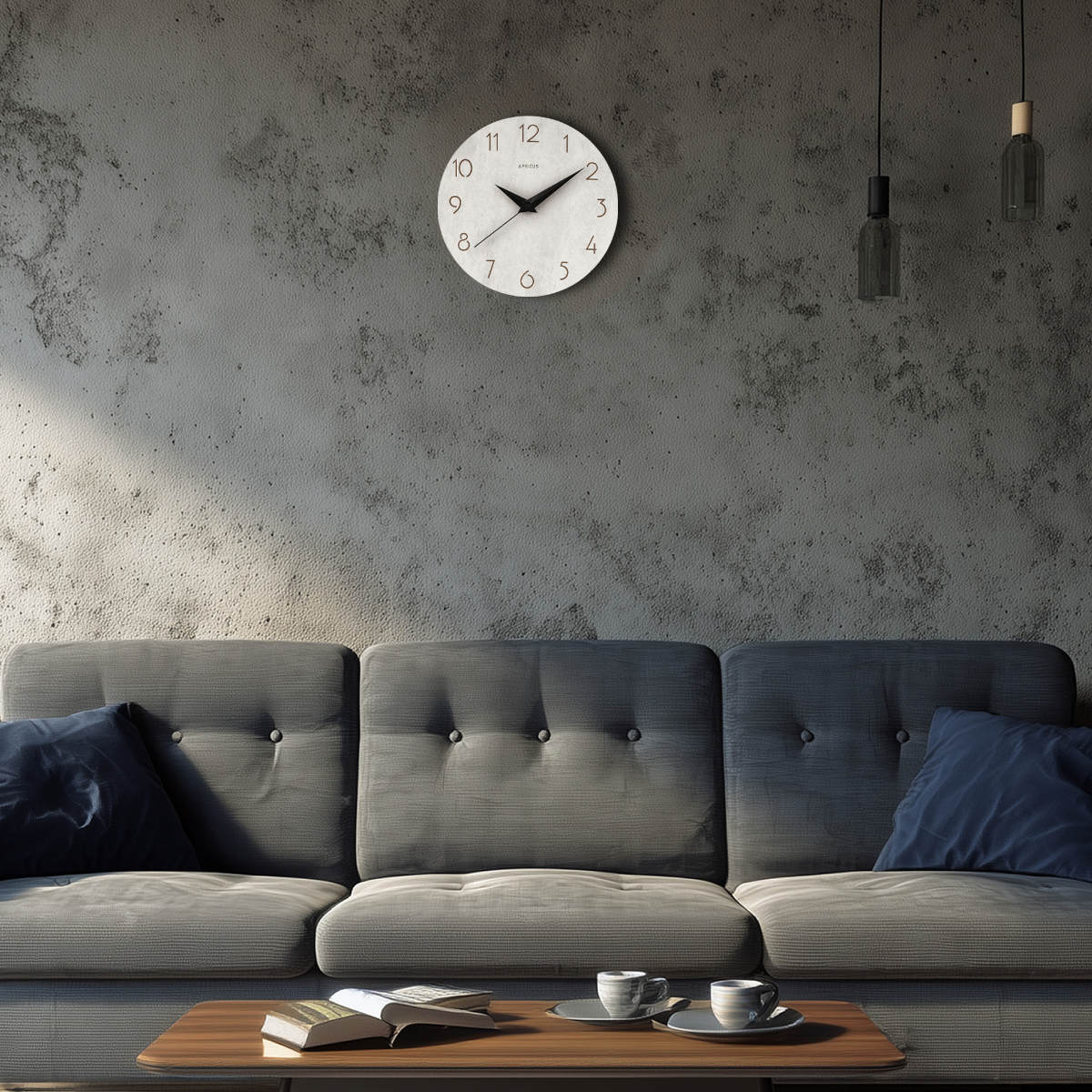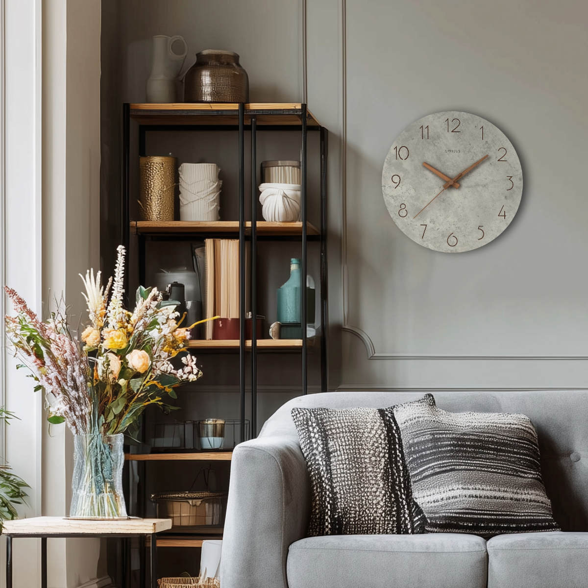 ●個性的なコンクリートの質感に異素材の長短針がアクセントになった掛け時計です。