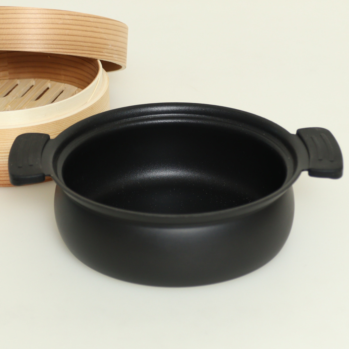 | 材質 | 本体:アルミニウム合金 (表面加工/内面:ふっ素樹脂塗膜加工、外面:焼付け塗装) はり底:ステンレス鋼(クロム16%) ハンドルカバー:シリコーンゴム フタ:アルミニウム合金 つまみ:フェノール樹脂 |