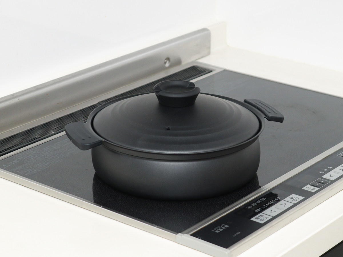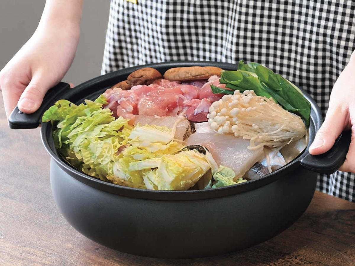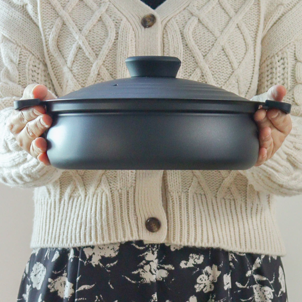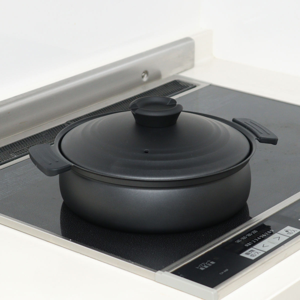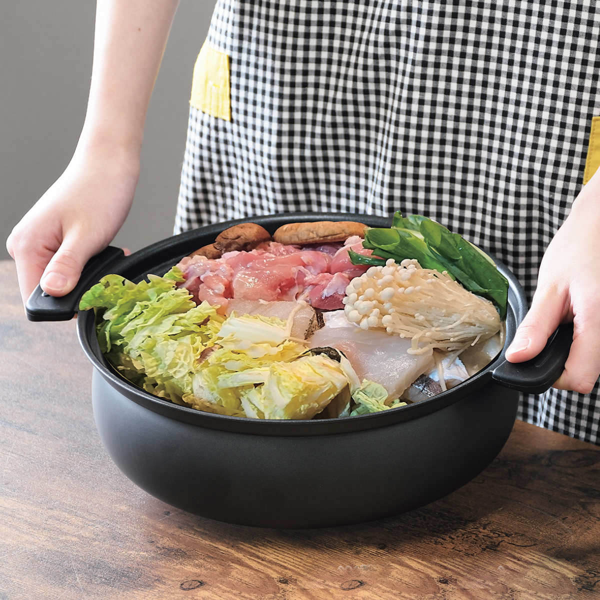 シックなブラックカラーが魅力的な、フッ素加工の卓上鍋です。2~3人分の料理にちょうどいいサイズで、雑炊やしゃぶしゃぶ、キムチ鍋など、様々な鍋料理に活躍します。IH・ガス火どちらにも使えます。
